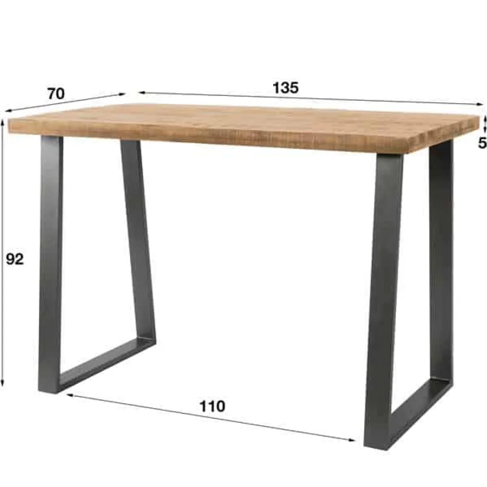Deze bartafel is 135 centimeter breed en is 70 centimeter diep. De tafel is vervaardigd uit massief manghout. Het tafelblad is opgedikt, waardoor hij 5 centimeter dik wordt. De geschuurde stalen poten zijn trapezevormig en hebben een dikte van 7,5 centimeter. Dit zorgt voor een stoere vintage-look.