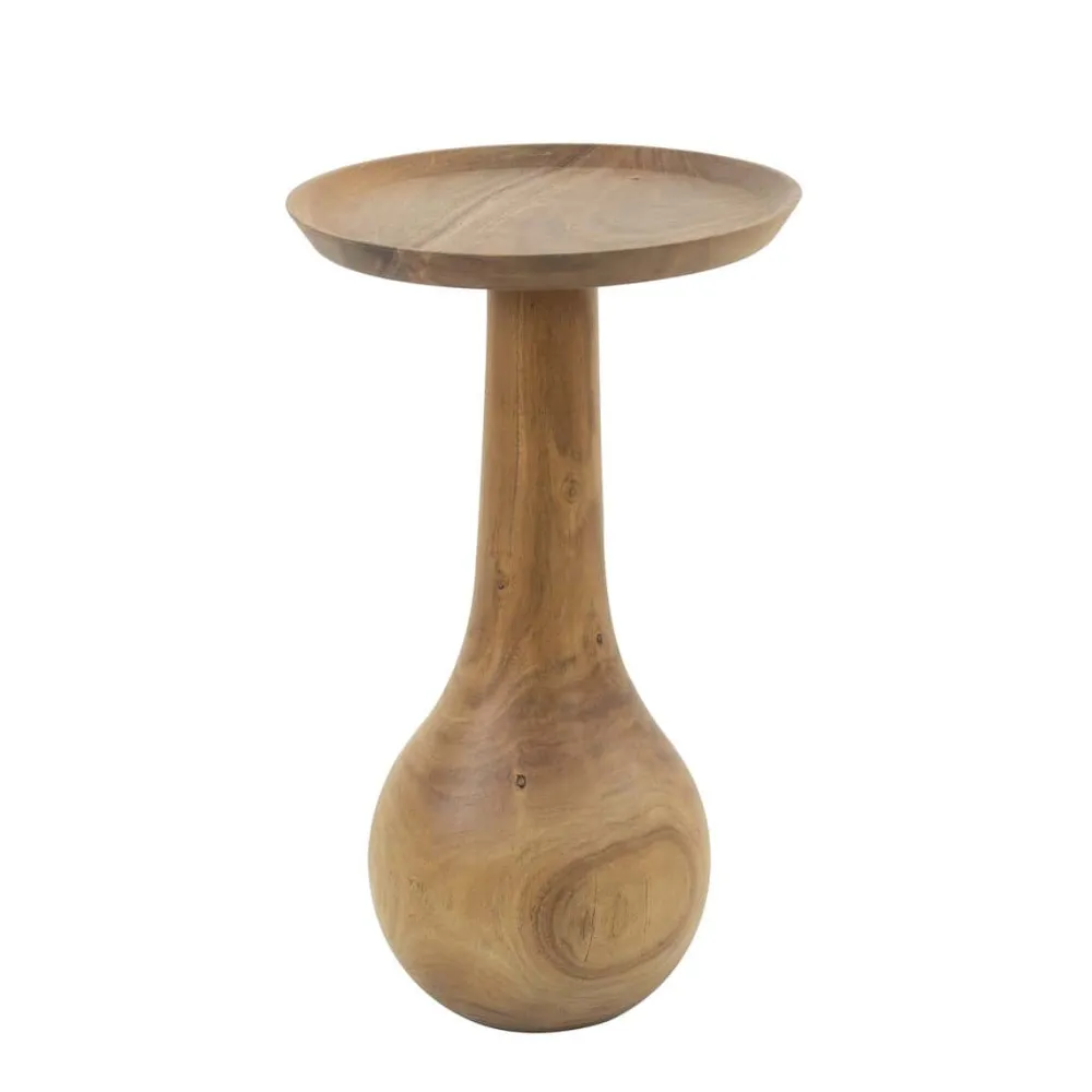Deze bijzettafel is vervaardigd uit massief acaciahout en heeft een tafelblad met een opstaand randje. De voet van de tafel heeft een elegante druppelvorm en is gemaakt uit één stuk acaciahout, wat zorgt voor een robuuste uitstraling. Omdat acaciahout een natuurlijk materiaal is, kunnen er na verloop van tijd droogtescheuren ontstaan, wat bijdraagt aan de authentieke look van de tafel.