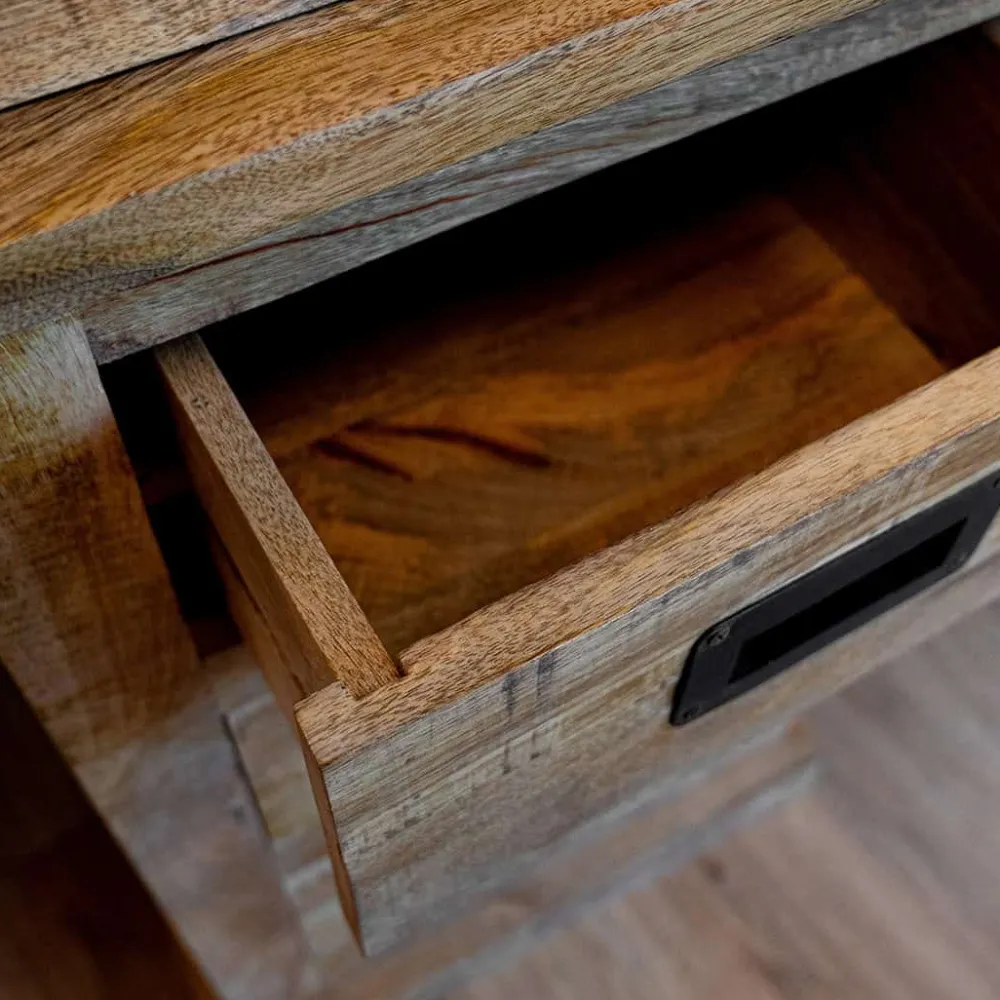 Mangohout is een levendig materiaal, wat betekent dat elk meubel uniek is in kleur, structuur en vorm. De buffetkast heeft een stoere look door de metalen roldeuren en handgrepen, en past perfect in verschillende interieurstijlen. Het sterke mangohout zorgt ervoor dat je jarenlang van deze kast kunt genieten.