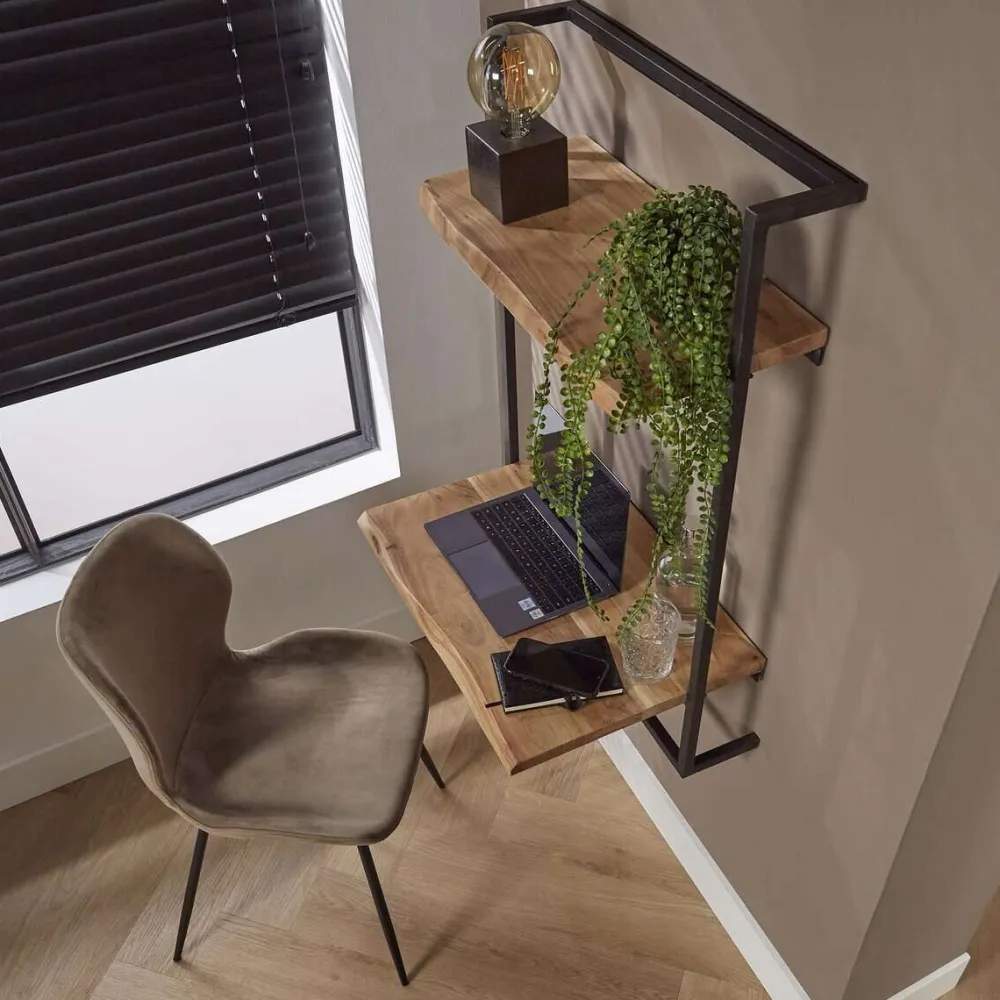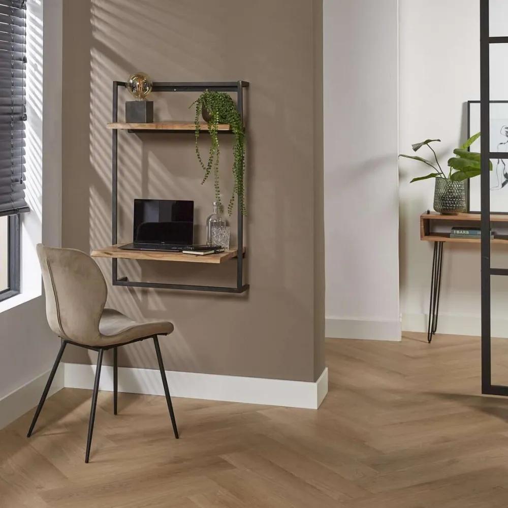 Bureau Joost is uitgevoerd in metaal met acaciahout, afgewerkt met een matte transparante lak. De combinatie van materialen geeft het bureau een eigentijdse uitstraling. Het bureau kan ook als kaptafel worden gebruikt en is ideaal voor kleinere ruimtes, omdat het opgehangen kan worden. Het wordt aan de muur gemonteerd met een strip met vier schroefgaten, en er zijn extra schroefgaten onder de houten planken voor extra stabiliteit.