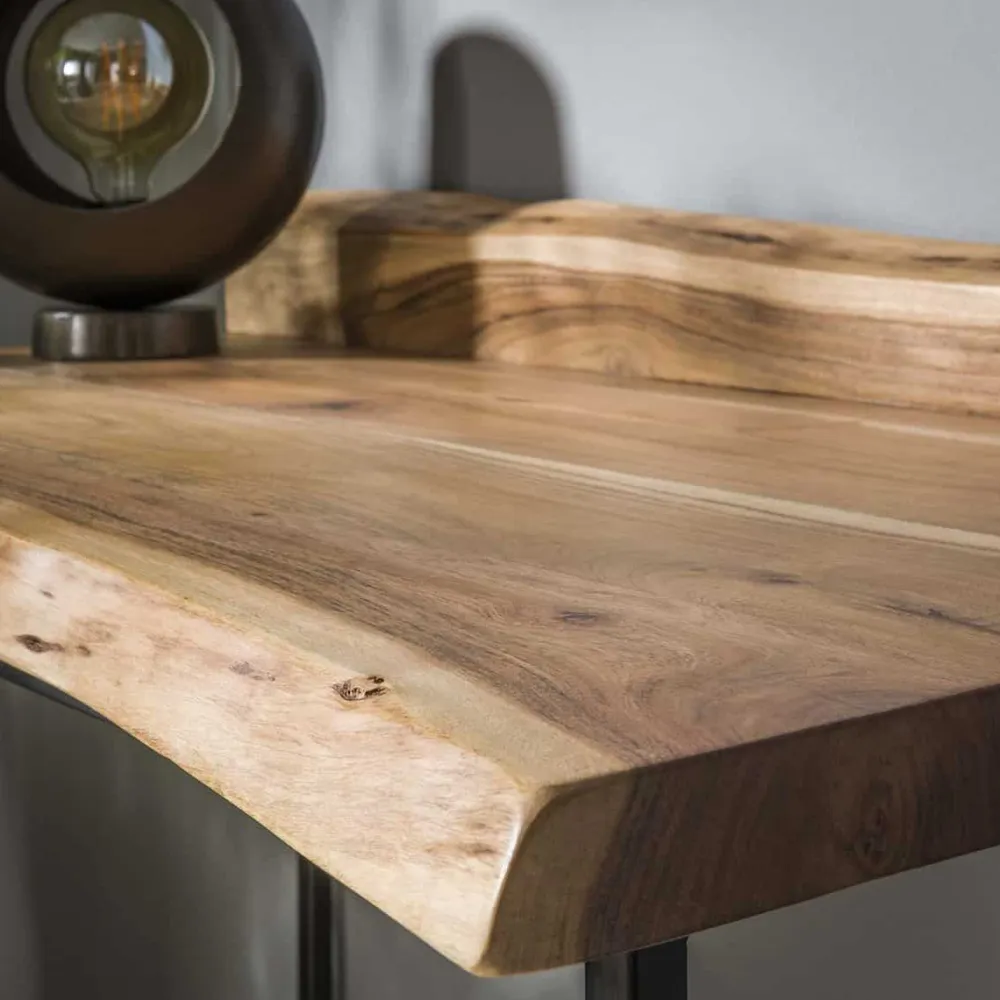 Bureau Liam is uitgevoerd in een acaciahout met een metalen frame. De prachtige boomstam-vorm maakt het bureau natuurlijk en robuust. Het metalen frame is netjes afgewerkt met een zwarte poedercoat finish. Met een bladdiepte van 60 cm kan er gemakkelijk een computer/laptop op staan en blijft er voldoende werkruimte over. Daarnaast kan dit bureau ook ingezet worden als kaptafel.
