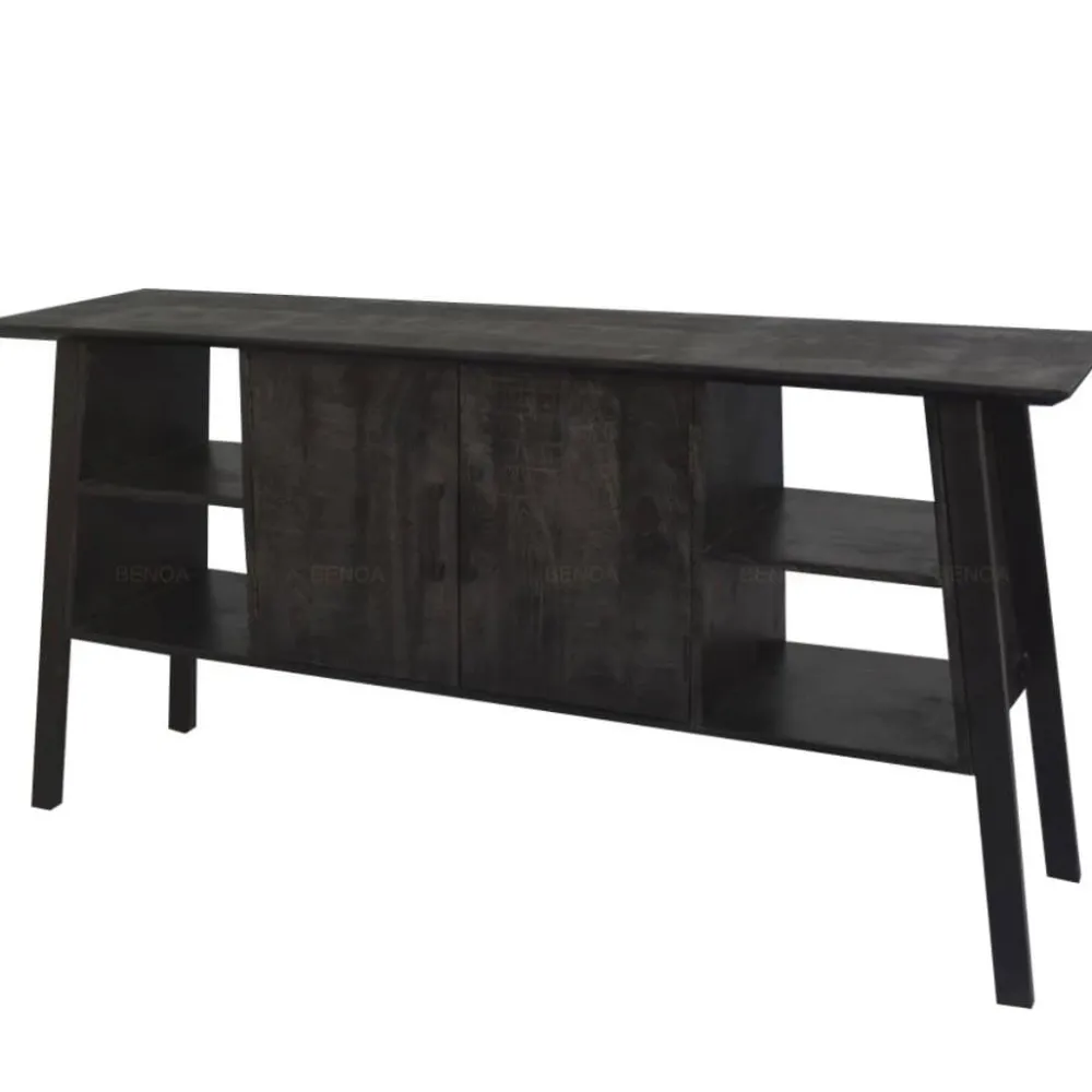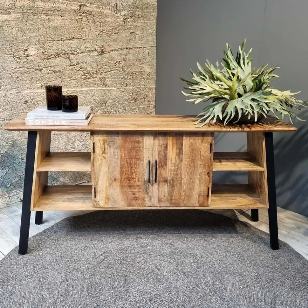 Strak zwart of naturel mangohout met ge-poedercoat stalen pootjes.