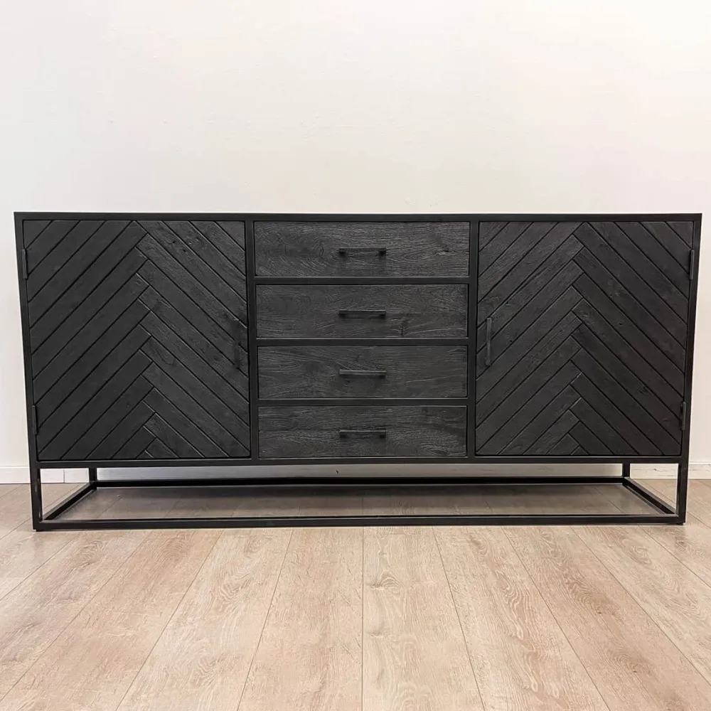 Dressoir Floor is een echte eyecatcher voor je interieur. Het dressoir heeft een strak en trendy ontwerp, gemaakt van zwart mangohout met een prachtig visgraat patroon op zowel de bovenkant als de deurtjes. Deze unieke afwerking geeft het meubel een luxe uitstraling, terwijl het tegelijkertijd modern en stijlvol blijft.