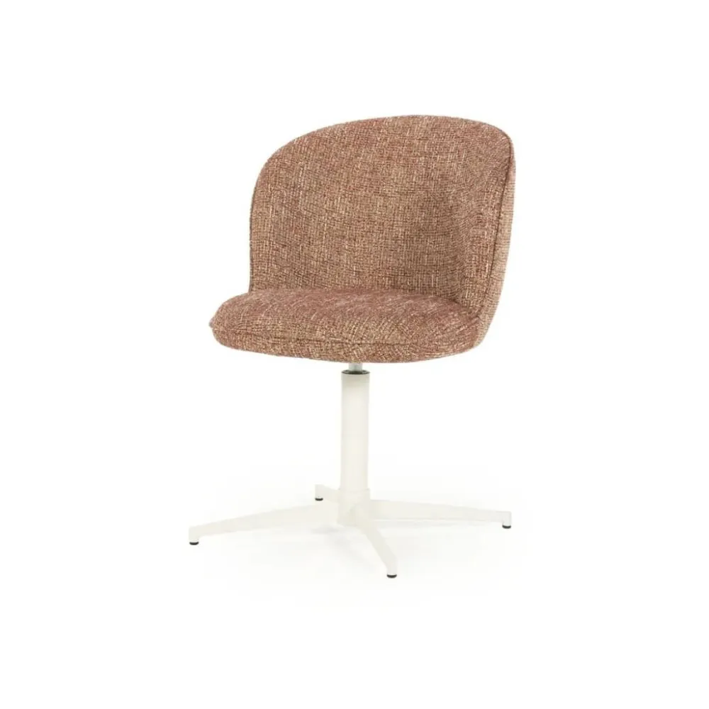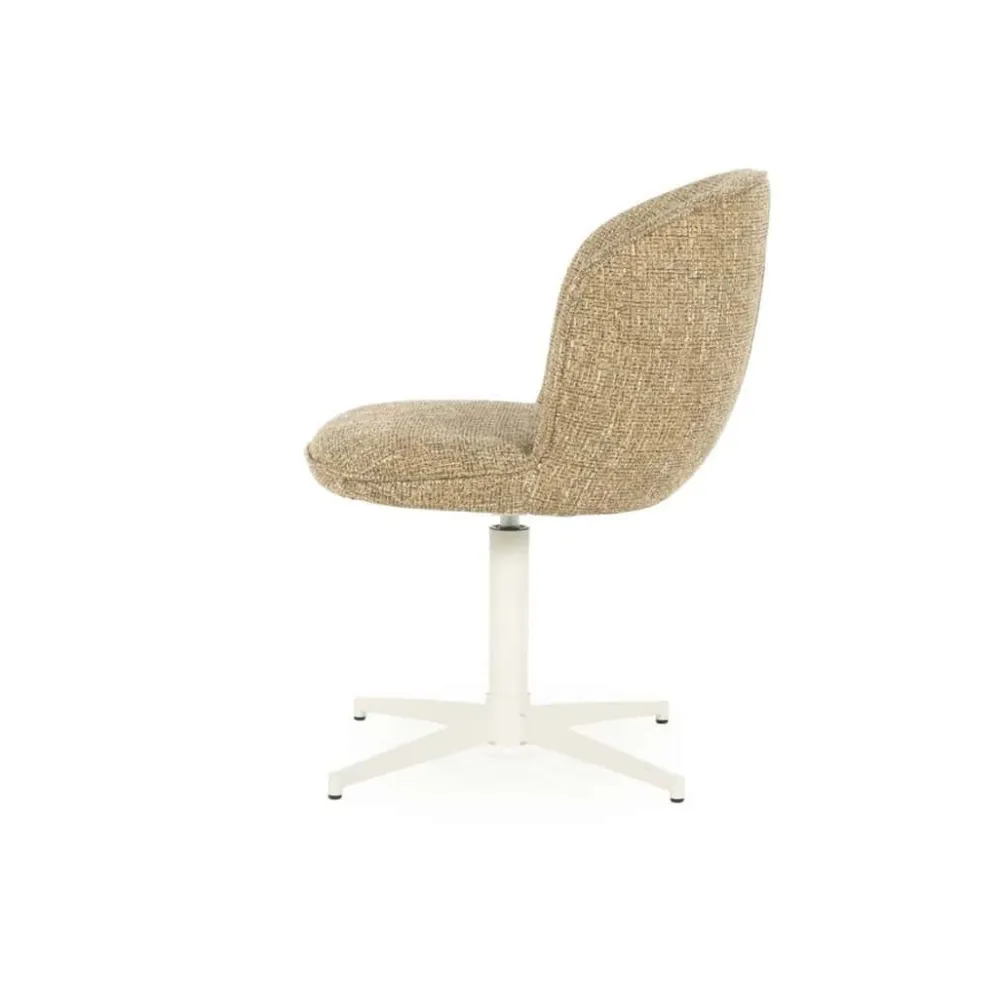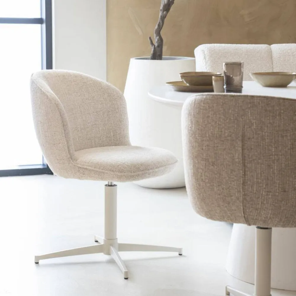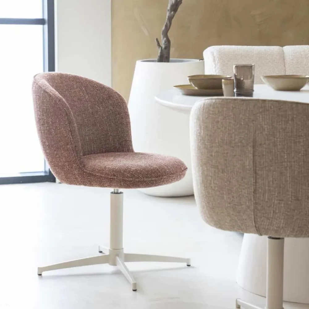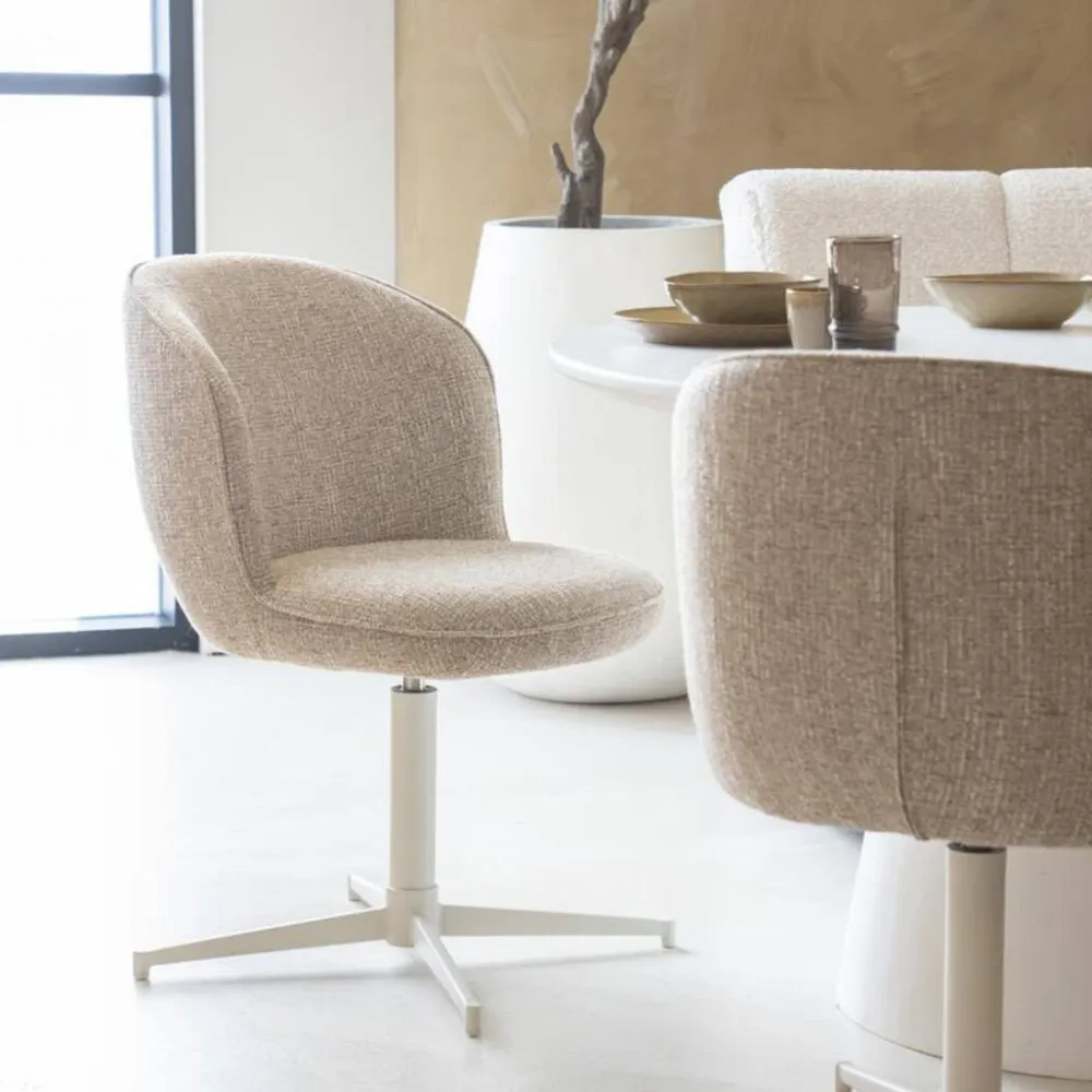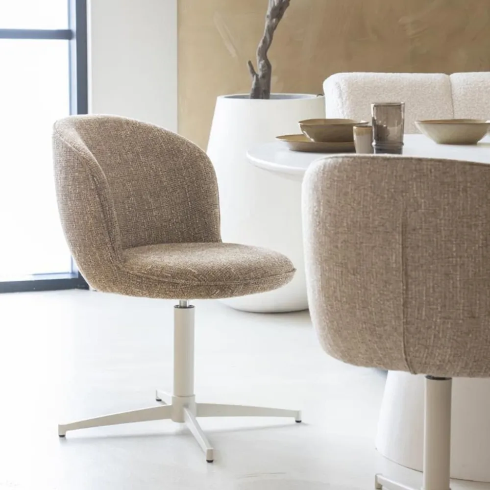 Eetkamerstoel Molly van Eleonora is een moderne en elegante draaistoel die stijl en comfort moeiteloos combineert. De volledig gestoffeerde kuipzitting heeft een zachte, ronde vorm en is verkrijgbaar in vier warme kleuren: taupe, beige, rood en mustard. Het zwarte metalen onderstel met poedercoating zorgt voor een stabiele basis en een luchtige uitstraling dankzij de open ruimte onder de zitting. Dankzij de 360 graden draaifunctie is Molly niet alleen een blikvanger aan tafel, maar ook bijzonder praktisch in gebruik.