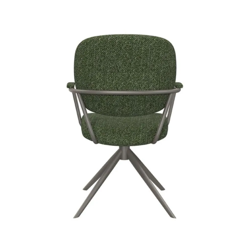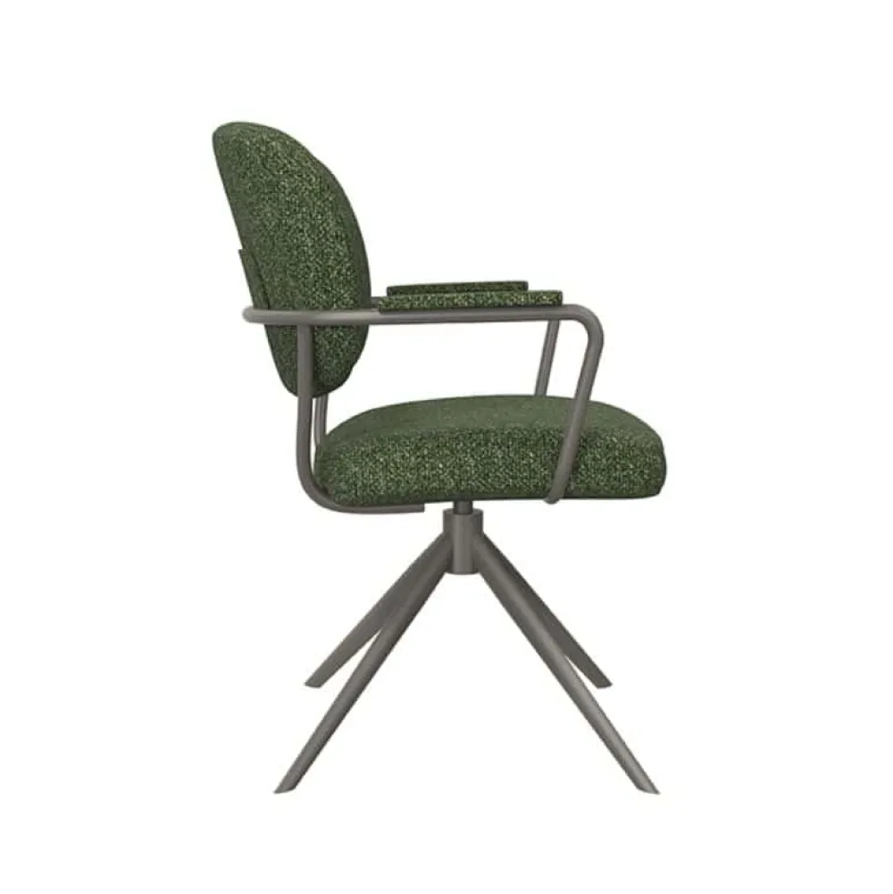Eetkamerstoel Basel is een moderne en comfortabele draaistoel met een verfijnd ontwerp. De kuipvormige zitting met rechte armleuningen is bekleed met zachte boucléstof en rust op een stijlvol X-frame van metaal. Dankzij de ton-sur-ton afwerking tussen stof en onderstel past Basel perfect binnen hedendaagse interieurtrends, van Scandinavisch tot minimalistisch. De 360 graden draaibare zitting met automatische terugkeer zorgt voor extra gemak én een opgeruimde uitstraling rondom de tafel.