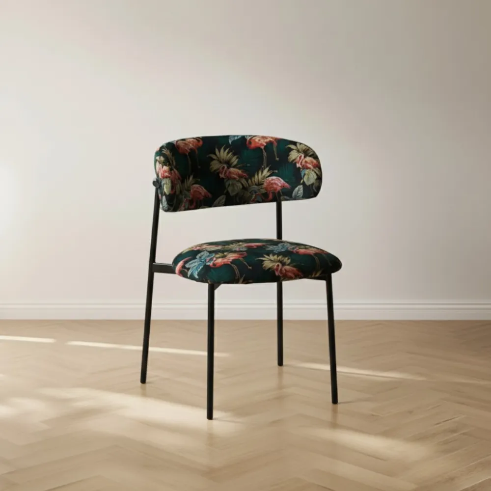– Eetkamerstoel Ferry is voorzien van een hip en kleurrijk flamingoprintje.