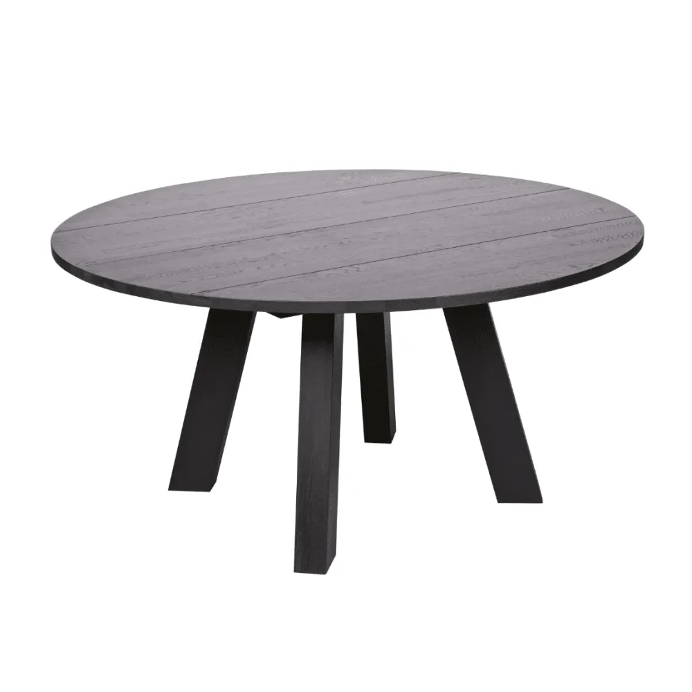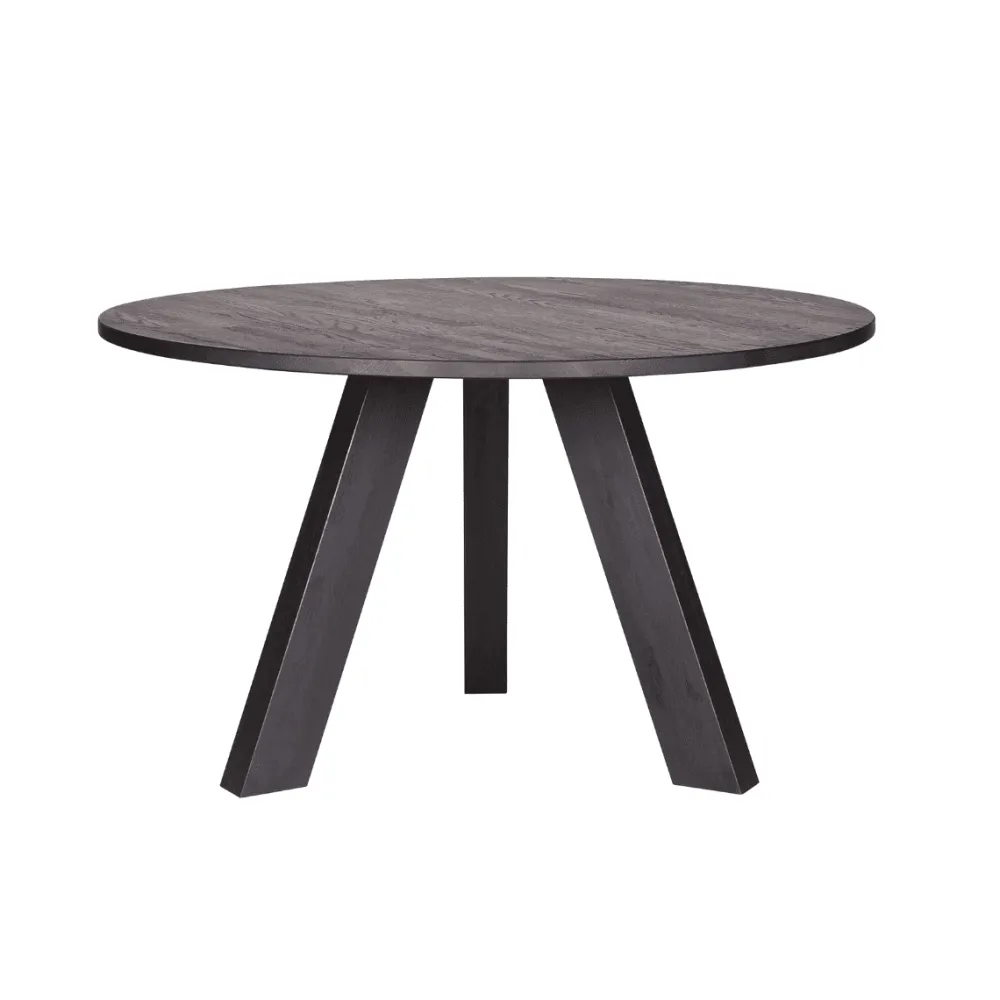 Deze massief eiken eettafel Rhonda van 129 cm in de kleur zwart is behandeld met 2-componenten waardoor het eiken slijtvast en water- en hittebestendig is. De eiken ondergrond is hierbij nog wel zichtbaar en zo behoudt de tafel zijn warme uitstraling. De eettafel heeft drie poten en een diameter van 130 cm, en is gemaakt van stroken verlijmd massief eikenhout (vingerlas).