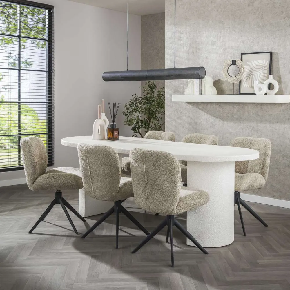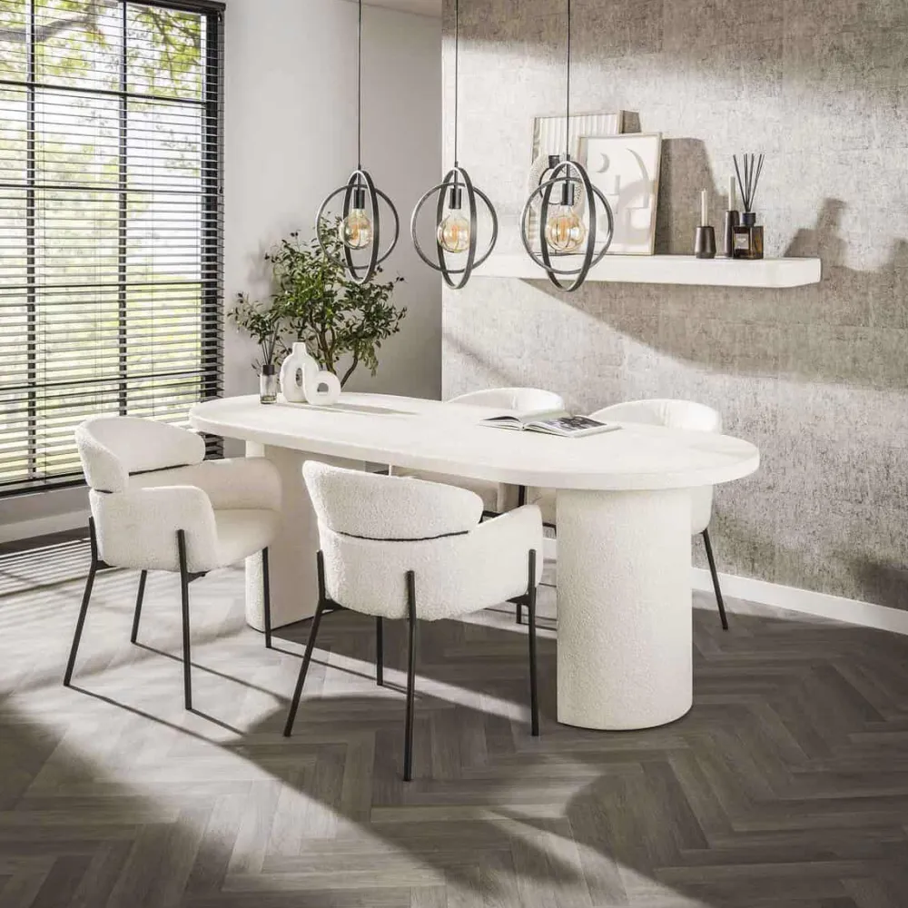 Deze prachtige Soraya eetkamertafel is uitgevoerd in marmer composiet. Een eigentijdse eetkamertafel met een frisse uitstraling. De tafel beschikt over kolompoten bestaande uit een halve maan. Deze tafel is perfect te combineren met de bijpassende salontafel of haltafel.