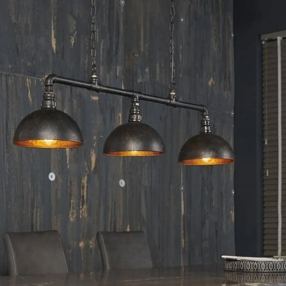 Het frame van deze 3-lichts hanglamp is vervaardigd van waterleidingbuizen. De halfronde metalen kappen zijn hieraan bevestigd. Middels kettingen hangt de complete lamp aan één plafondbevestiging.