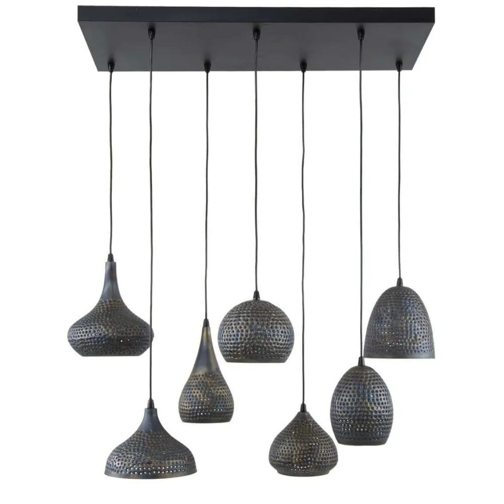 Deze hanglamp Frank heeft een een uniek en eigentijds design. De lamp heeft 7 verschillende kappen. De kappen zijn geperforeerd in combinatie met een bronze binnenkant wat ervoor zorgt dat het licht sfeervol en gedoseerd door de ruimte wordt verdeeld. De kappen zijn ieder afzonderlijk in hoogte verstelbaar tot 150 cm.