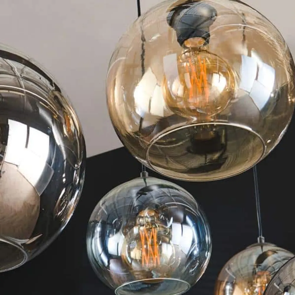Deze trendy hanglamp is uitgevoerd in metaal met zeven glazen kappen. De kappen bestaan uit drie verschillende maten en er wordt gebruik gemaakt van drie verschillende kleuren, namelijk: chroom, amber en licht grijs. Deze lamp is een echte eye-catcher! De lamp is tot 150 cm in hoogte verstelbaar. Er wordt aanbevolen LED lichtbron 9,5 cm te gebruiken.