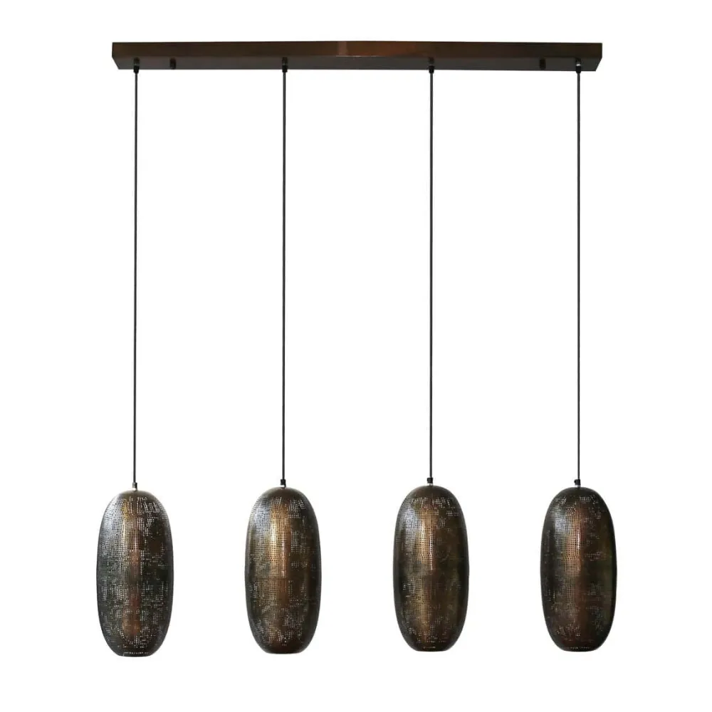 Deze hanglamp Helena is uitgevoerd in metaal met een brons antiek finish. Door de handgewerkte gaatjes komt er voldoende licht vrij en wordt de ruimte mooi gedoseerd verlicht. Deze lamp geeft ieder huis een beetje meer sfeer! De kappen zijn afzonderlijk van elkaar 150 cm in hoogte verstelbaar. Er wordt aanbevolen LED lichtbron filament buis 18.5cm te gebruiken.