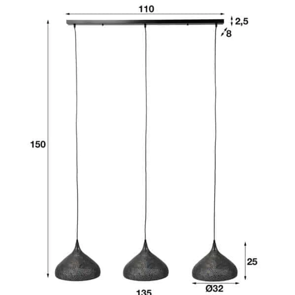 Deze 3-lichts hanglamp is uitgevoerd in metaal in de kleur zwart/bruin. De trechtervormige kappen zijn voorzien van perforator gaatjes, waardoor het licht op een mooie manier erdoor heen schijnt. De plafondbevestiging, waar de kappen aanhangen, heeft dezelfde zwart/bruine kleur.