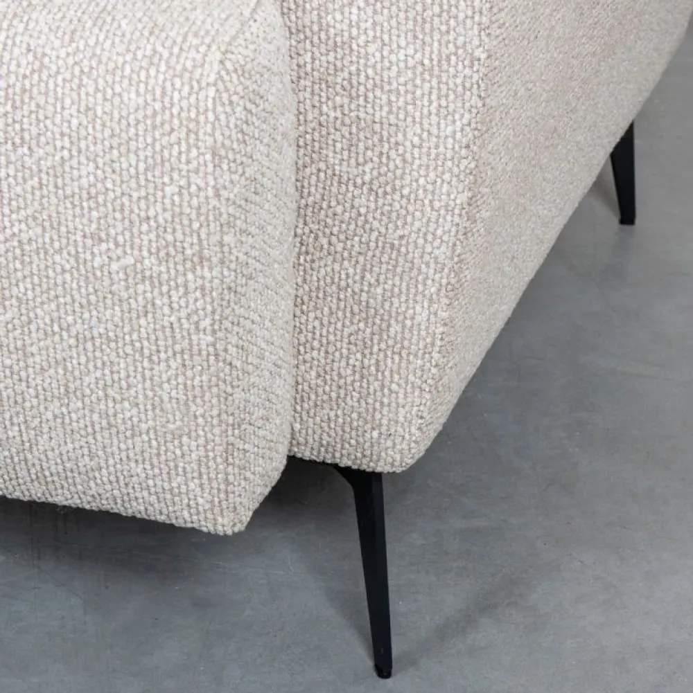 De combinatie van nosagvering, pocketvering en hoogwaardig foam zorgt voor een prettig en ondersteunend zitcomfort. Bovendien draagt de bouclé stof bij aan een zachte uitstraling met een verfijnde textuur. De hoge zwartmetalen poten geven de bank een statige look en zorgen tegelijk voor een ruimtelijk effect in het interieur.