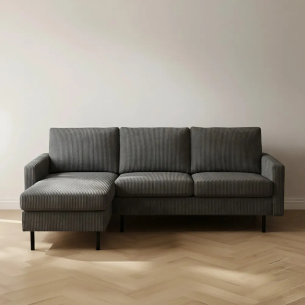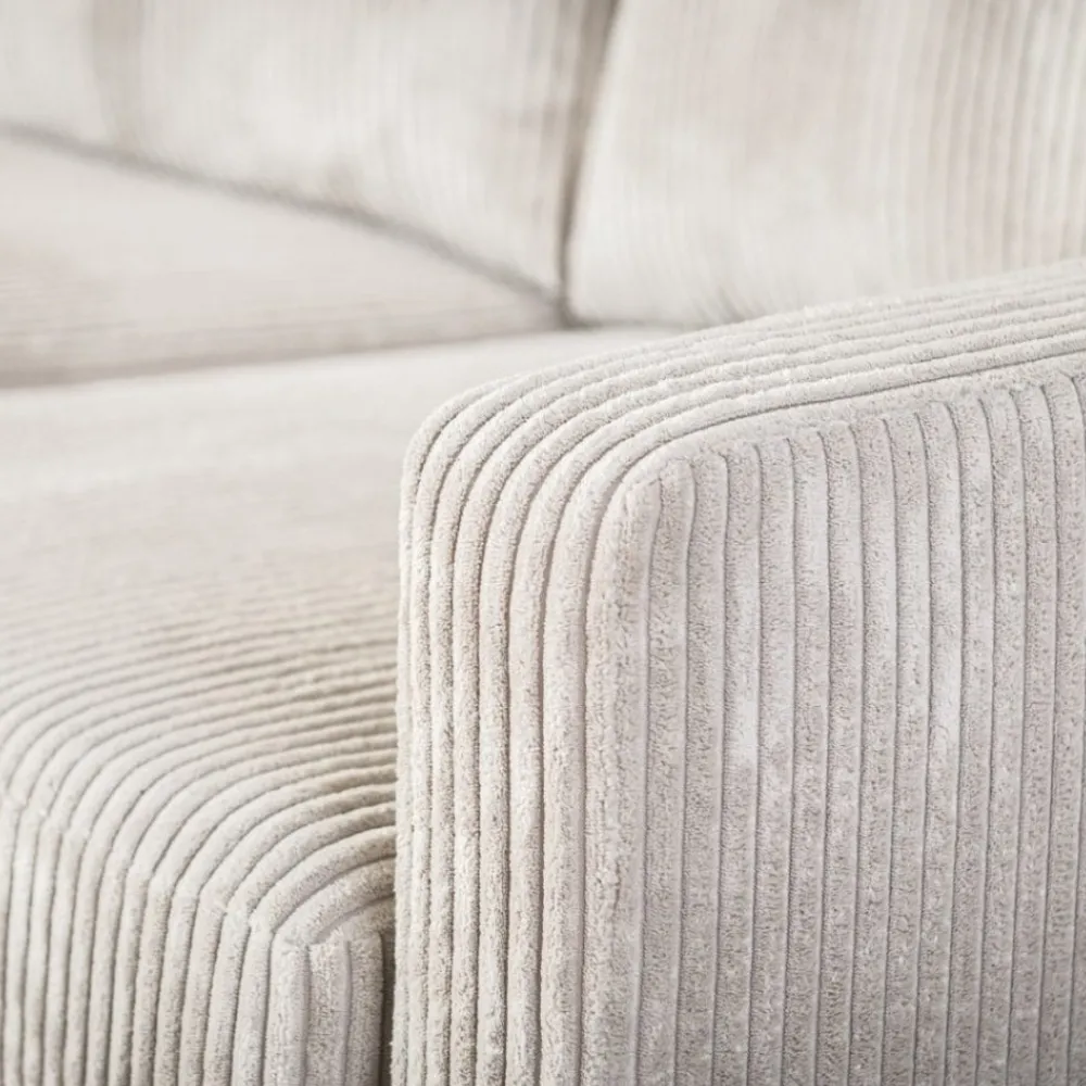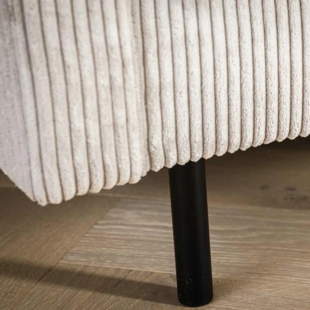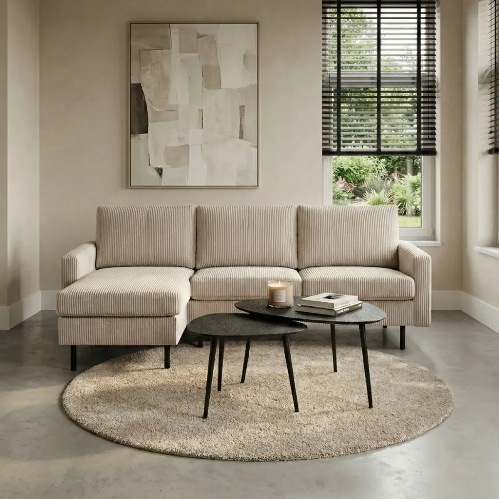 De hoekbank Steije van HUUS combineert eigentijdse vormgeving met optimaal comfort. Dankzij het compacte ontwerp is deze bank ideaal voor kleinere woonruimtes, zonder dat je hoeft in te leveren op stijl of zitgemak. De zachte ribstof bekleding geeft de bank een warme en uitnodigende uitstraling, terwijl de fijne structuur zorgt voor extra textuur in je interieur.