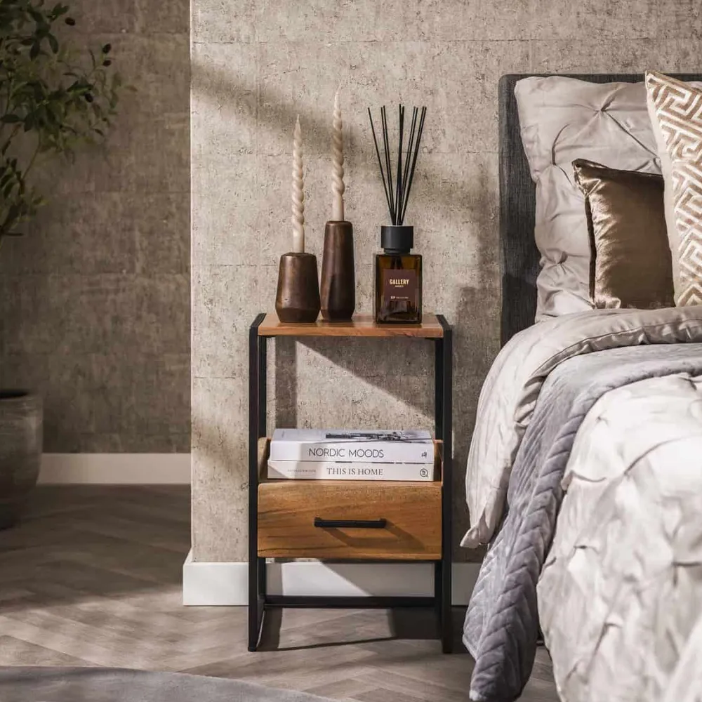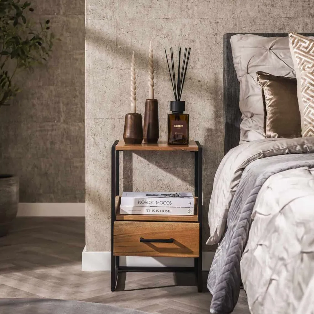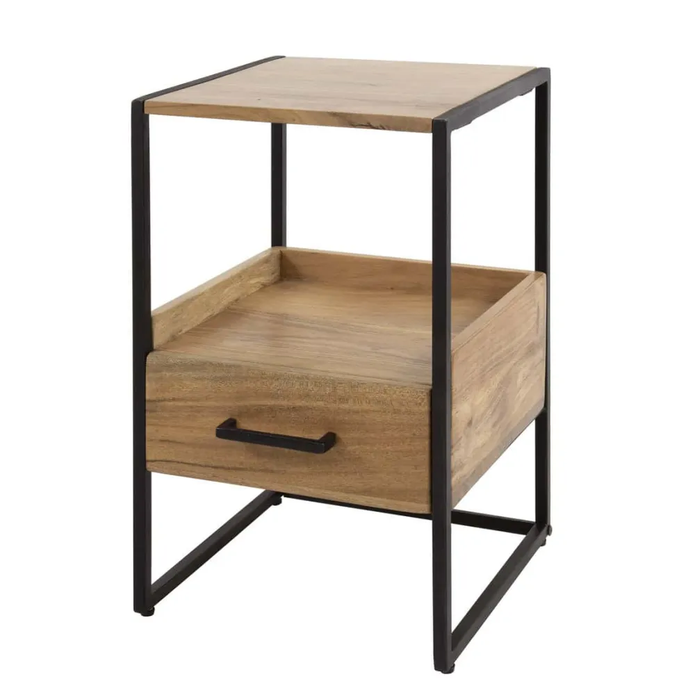 Dit nachtkastje Desire is uitgevoerd in acacia hout. Het nachtkastje heeft een lade, een open vak en een metalen onderstel. Het nachtkastje heeft een afmeting van 35x35cm en is dus heel compact. Ideaal voor een kleinere slaapkamer!