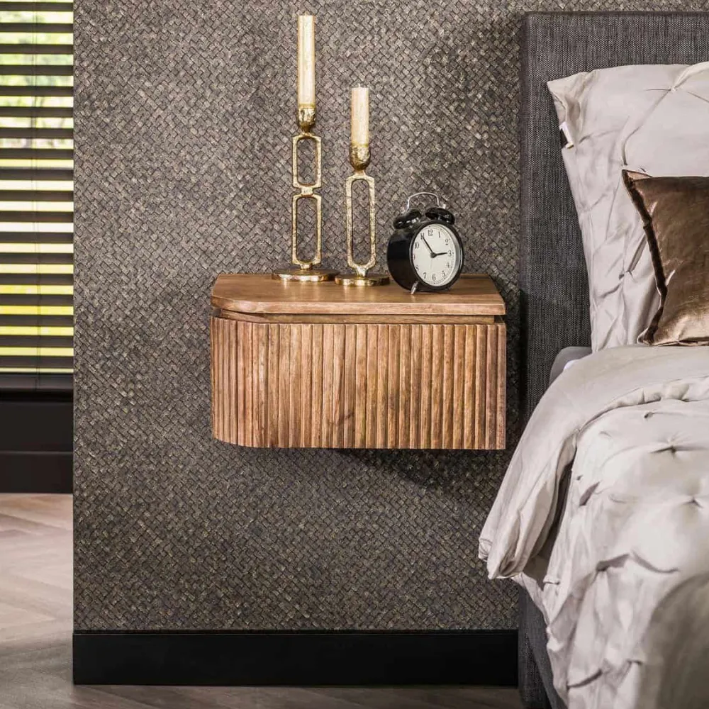 Dit hangende nachtkastje Elida bestaande uit een set van 2 is gemaakt van duurzaam mango hout en heeft een eigentijds design met een golfontwerp. De set bestaat uit een linker en een rechter kant. Het wordt bevestigd aan de muur met een strip met drie schroefgaten, waardoor het zweeft en ruimte bespaart. Zie hiervoor de foto.