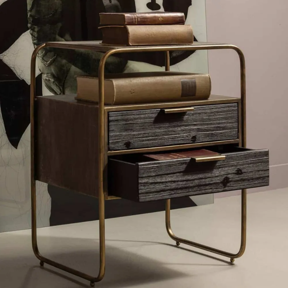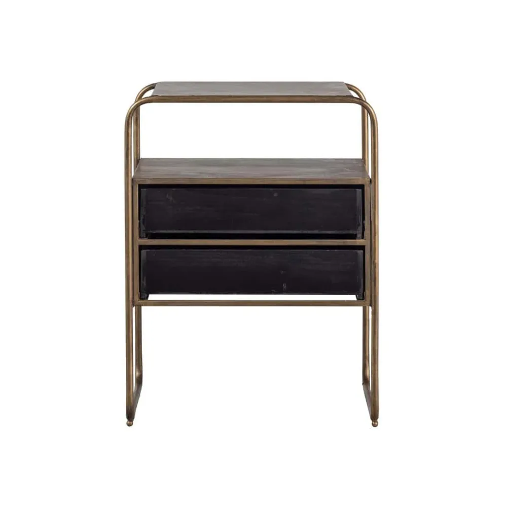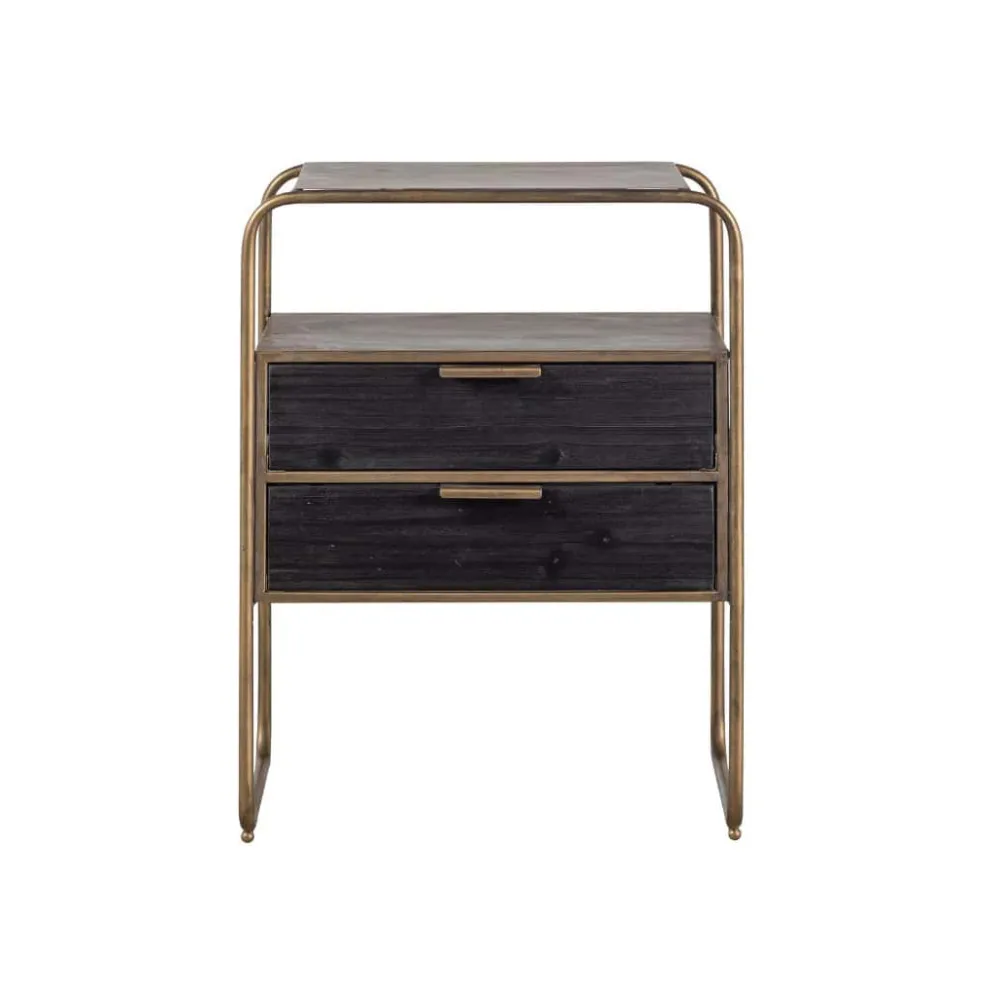 Polite is gemaakt van sterk metaal met een antique brass poedercoating. Dit sterke materiaal kan wel tegen een stootje, maar houdt niet van nattigheid, hierdoor kan snel roest ontstaan. De twee lades zijn gemaakt van hout met een zwarte kleuring. Het robuuste hout heeft een duidelijke nerftekening wat het kastje een stoere uitstraling geeft.