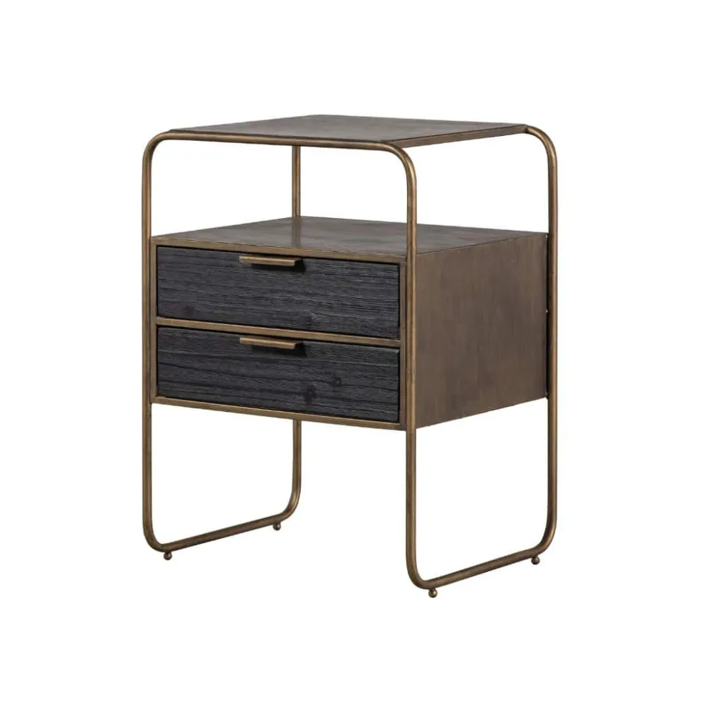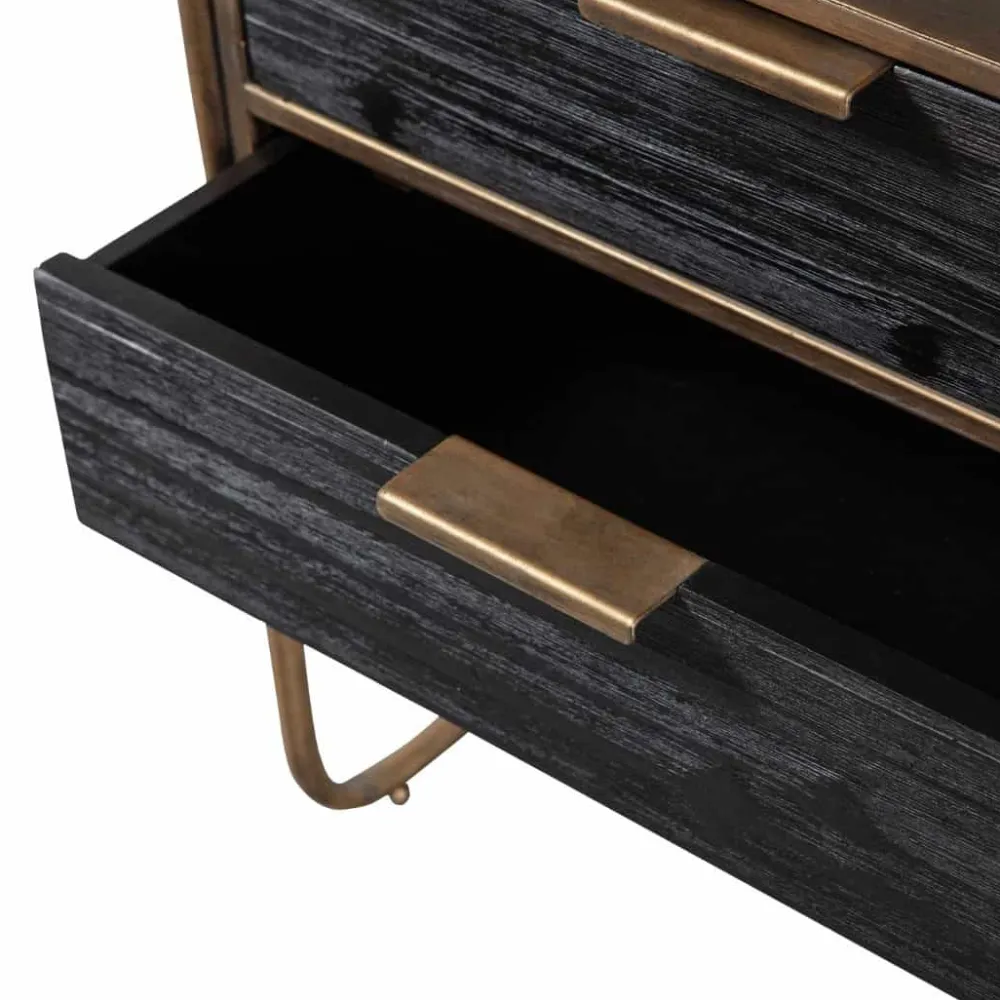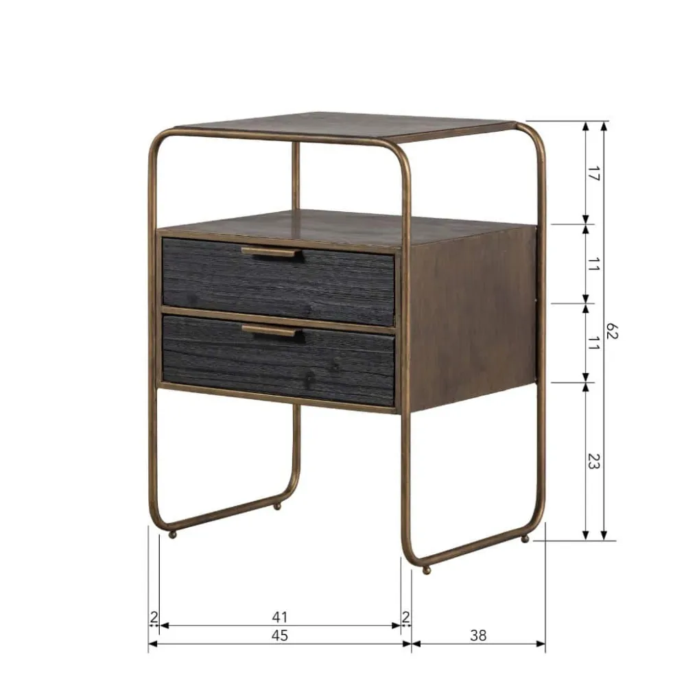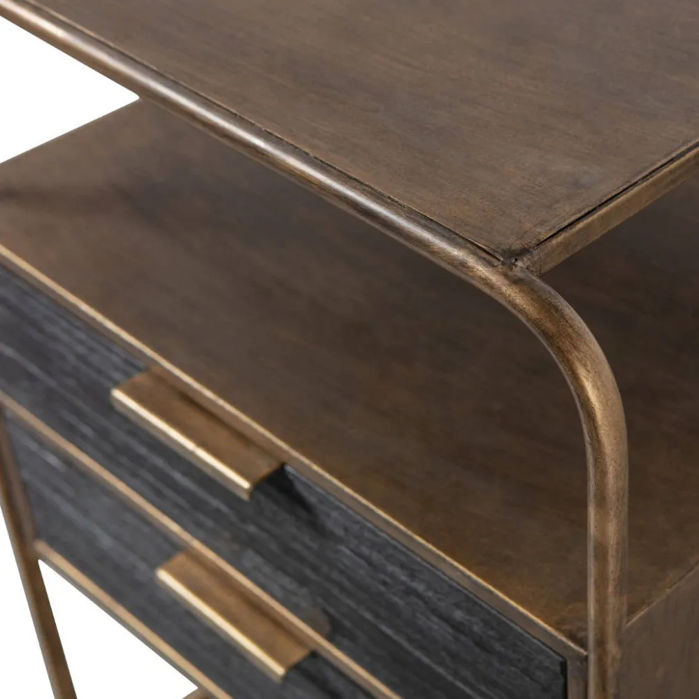 Polite is gemaakt van sterk metaal met een antique brass poedercoating. Dit sterke materiaal kan wel tegen een stootje, maar houdt niet van nattigheid, hierdoor kan snel roest ontstaan. De twee lades zijn gemaakt van hout met een zwarte kleuring. Het robuuste hout heeft een duidelijke nerftekening wat het kastje een stoere uitstraling geeft.