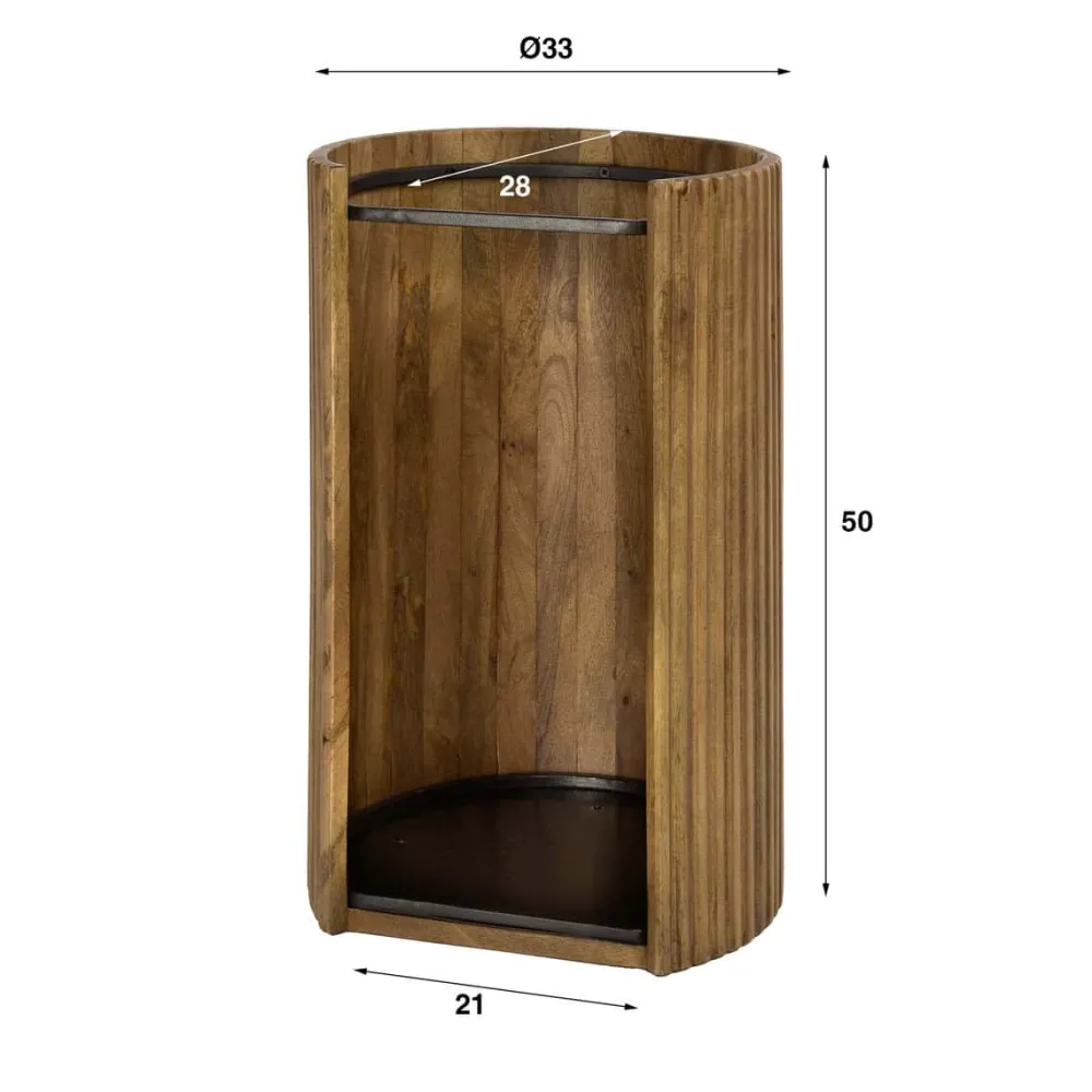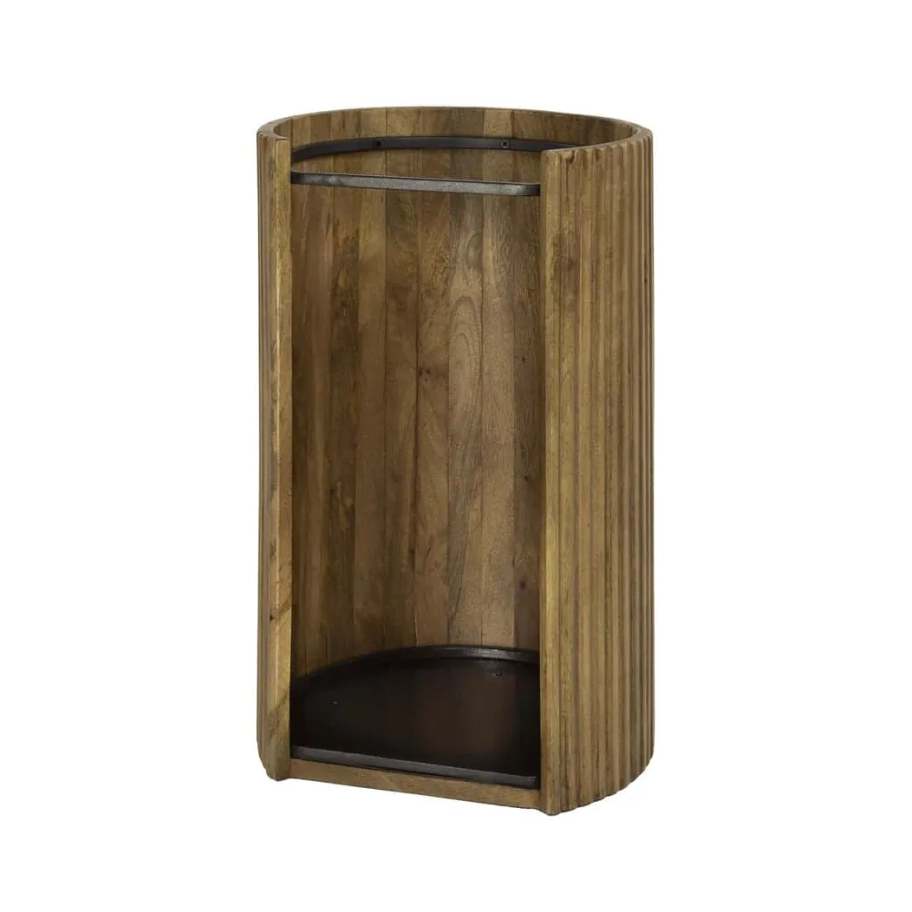 Paraplubak Terry is gemaakt van mangohout met een zandkleurige afwerking en een golvend patroon aan de buitenzijde. De verticale groeven zorgen voor een opvallende textuur. De binnenzijde is voorzien van een metalen frame om paraplu’s op hun plaats te houden. Geschikt voor gebruik in de hal of entree.