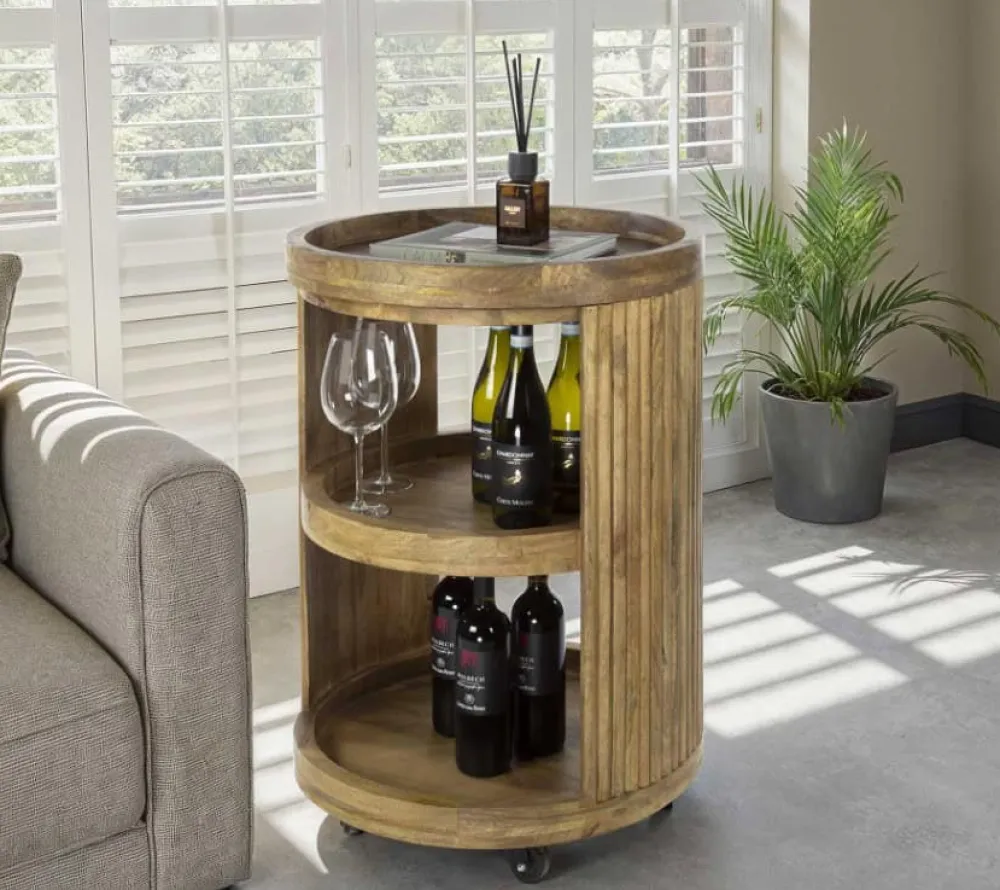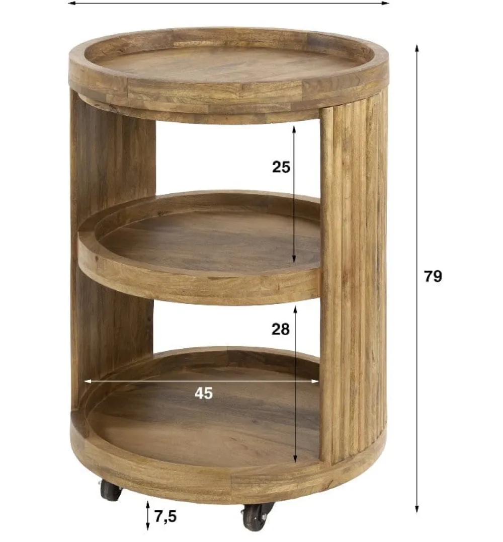 Wijntrolley Terry is gemaakt van mangohout met een zandkleurige finish en voorzien van drie ronde leggers. De zijkanten zijn afgewerkt met het kenmerkende wave patroon dat zorgt voor een speels lijnenspel in het ontwerp. Dankzij de open structuur en het lichte hout oogt de trolley luchtig en verfijnd.