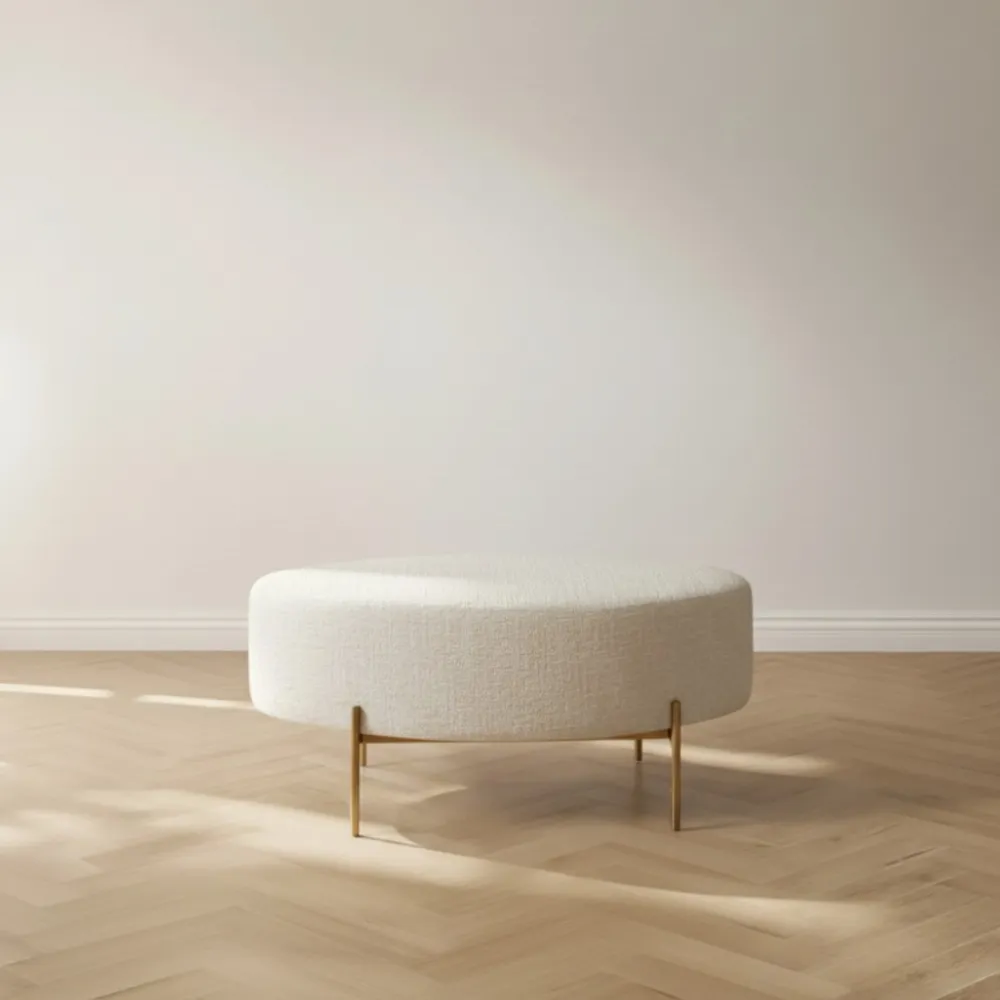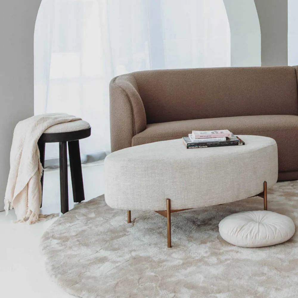 De Poef Ossana – Anouk van HUUS combineert elegantie met veelzijdigheid. Bekleed met een prachtige luxe stof en voorzien van een metalen onderstel in goud of naturel, straalt deze poef een hotel chique sfeer uit. Met zijn royale formaat biedt hij niet alleen extra zitruimte, maar dient hij ook als stijlvolle toevoeging aan je interieur. Combineer hem met andere items uit de Ossana-collectie voor een harmonieus geheel.