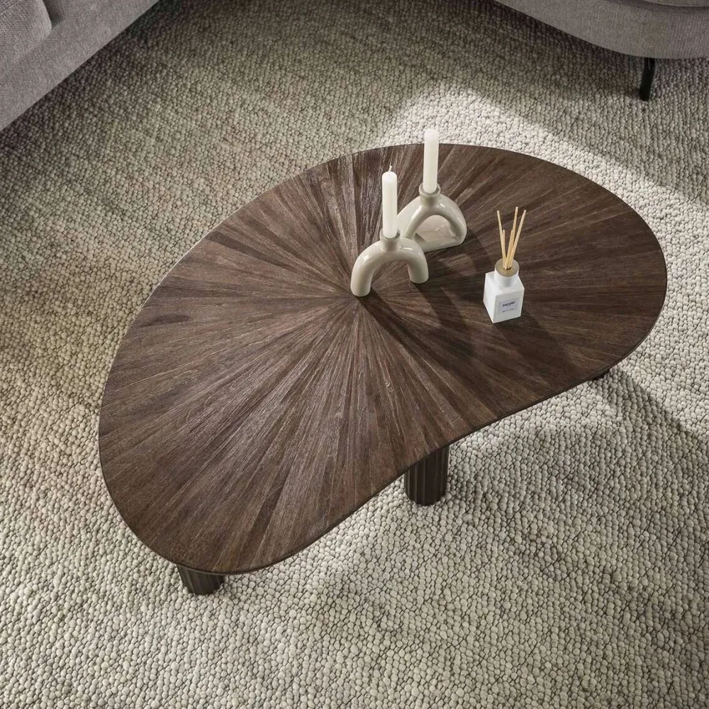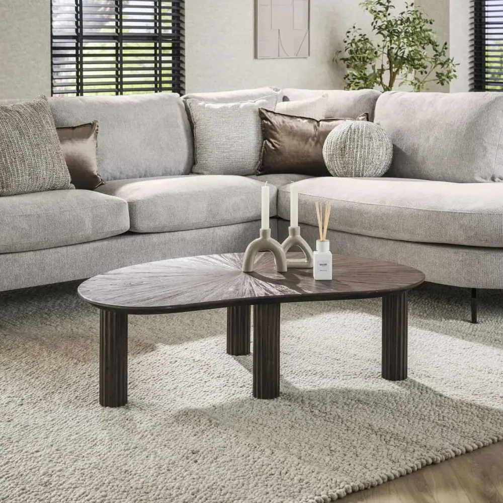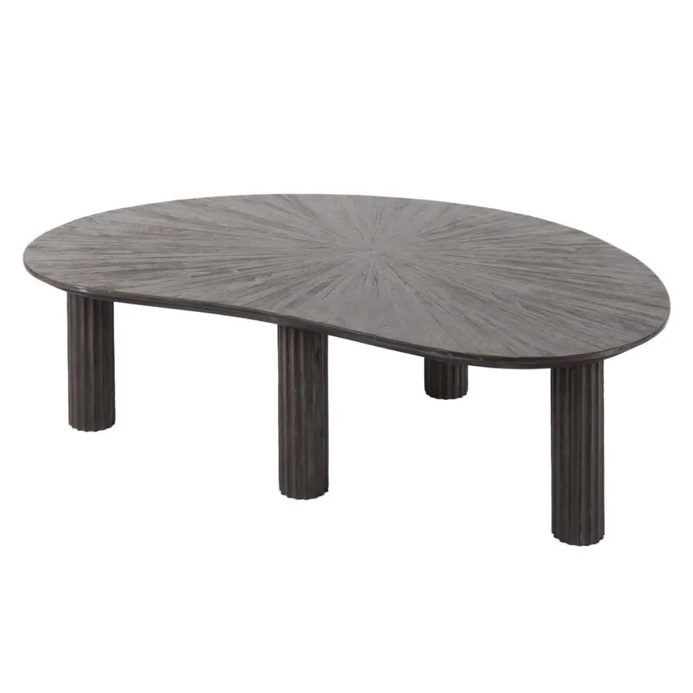 Deze prachtige salontafel is ontworpen in een niervorm en uitgevoerd in hoogwaardig teakhout met een eigentijdse donkerbruine kleur. Deze combinatie zorgt ervoor dat deze tafel zowel stijl als duurzaamheid uitstraalt. De unieke pootjes met een golfpatroon en het unieke ontwerp van het tafelblad zorgen voor een speelse, maar verfijnde uitstraling.