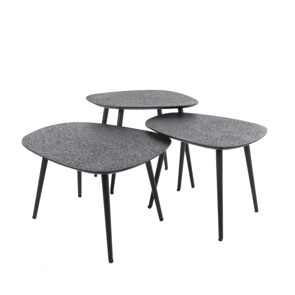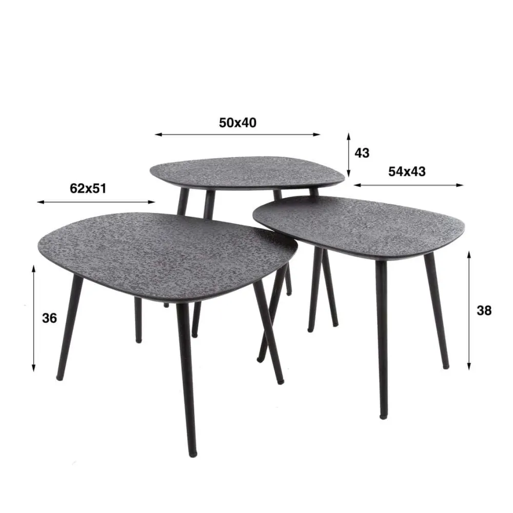 Deze trendy vierhoekige salontafel set van 3 is uitgevoerd in ‘metallic’ zwart. Op het blad zit een hele mooie bewerking welke een unieke uitstraling geeft. De tafels kunnen naar eigen inzicht speels bij elkaar neergezet worden.