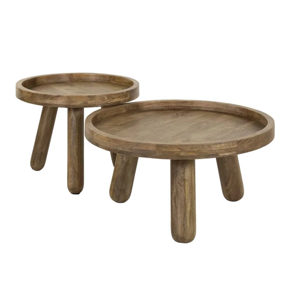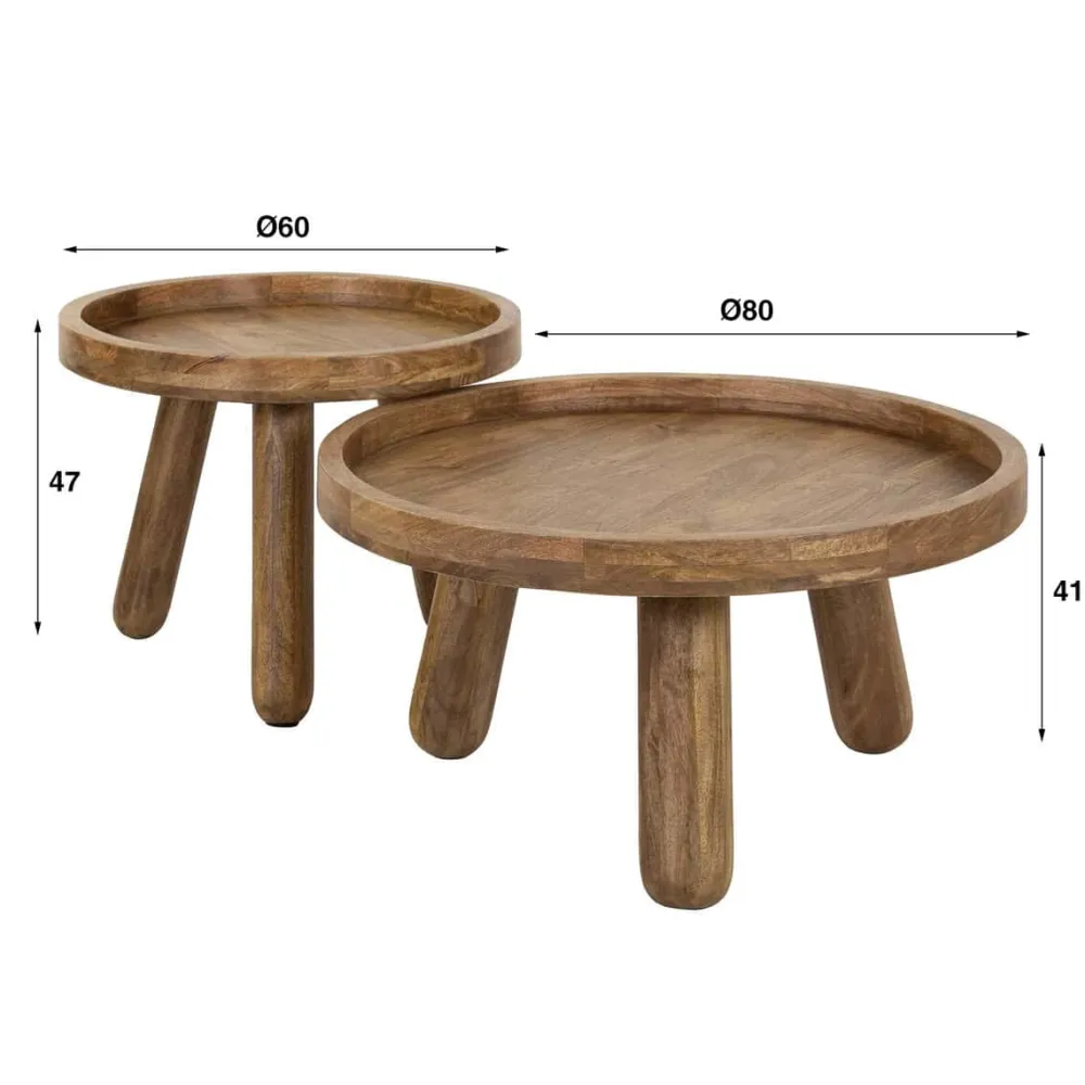 Deze trendy salontafel set van 2 is uitgevoerd in duurzaam mangohout met een zandkleurige finish. De tafels beschikken over een opstaande rand, want zorgt voor een extra dimensie. De tafels kunnen naar eigen inzicht naast elkaar geplaatst worden. De hoogste tafel heeft een diameter van 60 centimeter en een hoogte van 47 centimeter en de lagere tafel heeft een diameter van 80 centimeter en een hoogte van 41 centimeter.