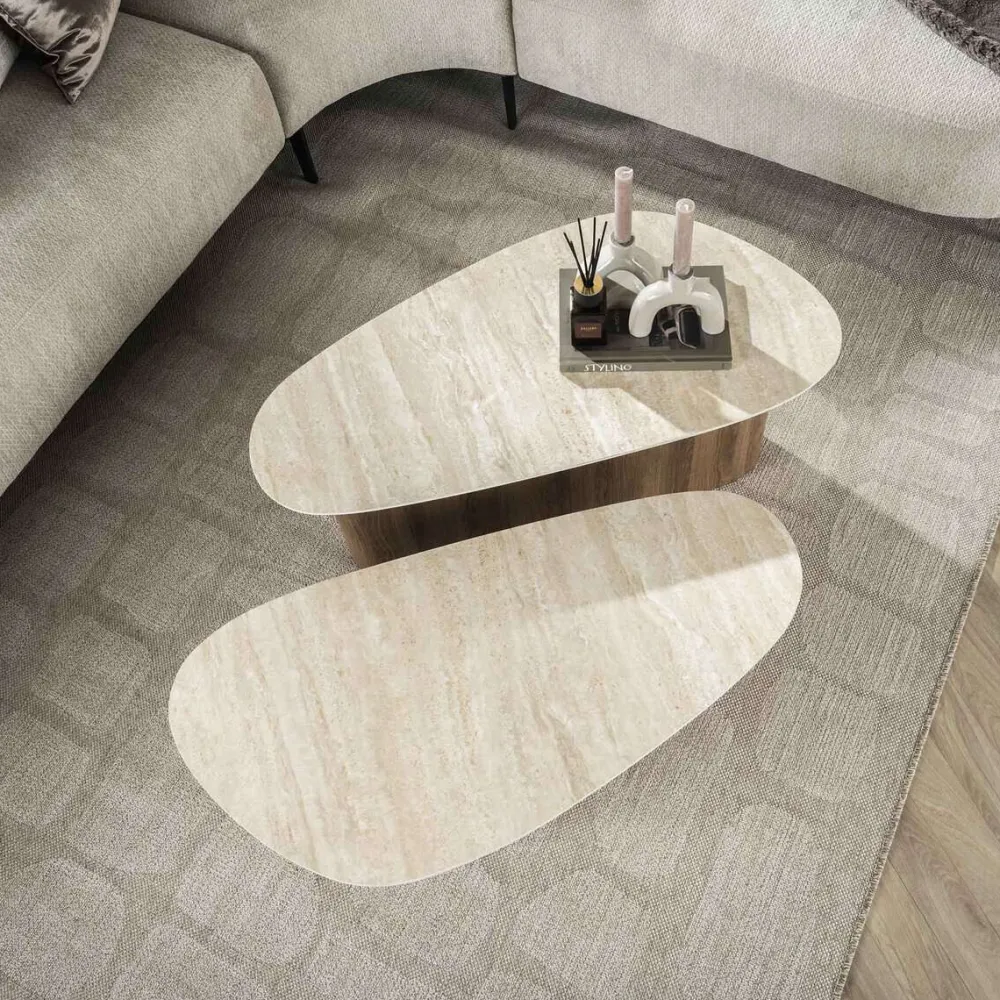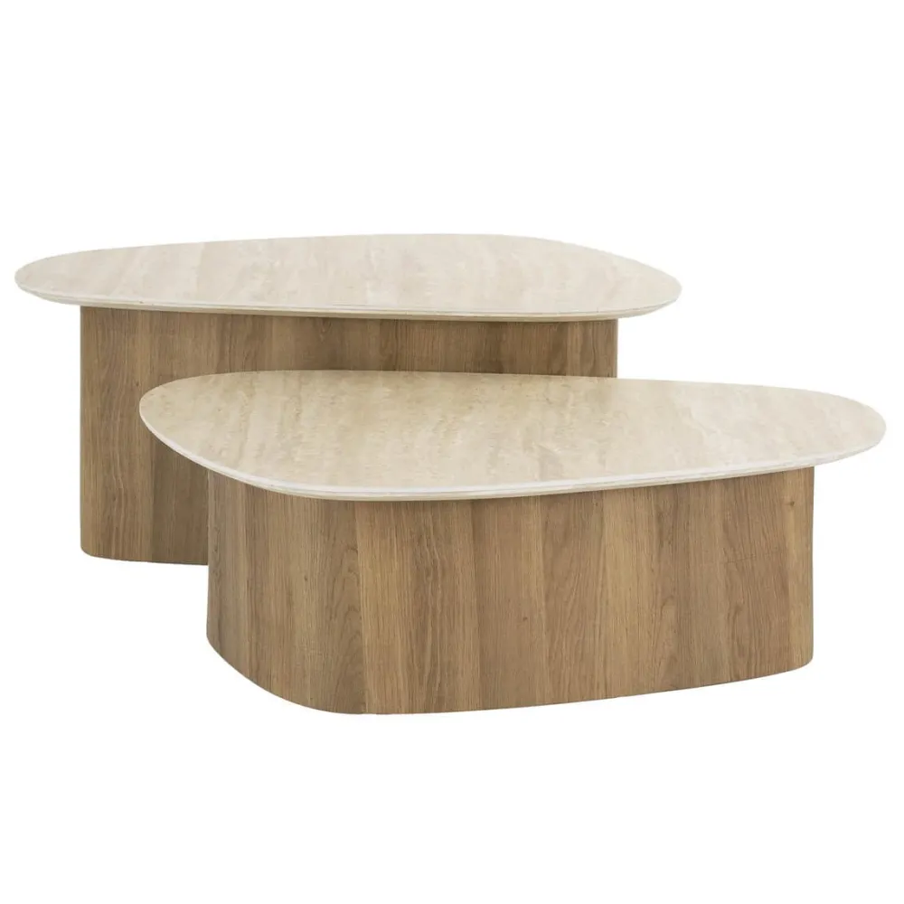Deze elegante driehoekig gevormde salontafel set van 2 combineren een stevig houten frame met een luxe ceramic blad met travertin look waardoor ze een verfijnde uitstraling hebben. Perfect voor zowel moderne als klassieke interieurs. Deze tafels zijn veelzijdig en functioneel.