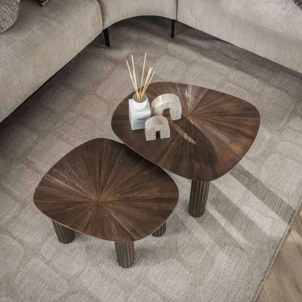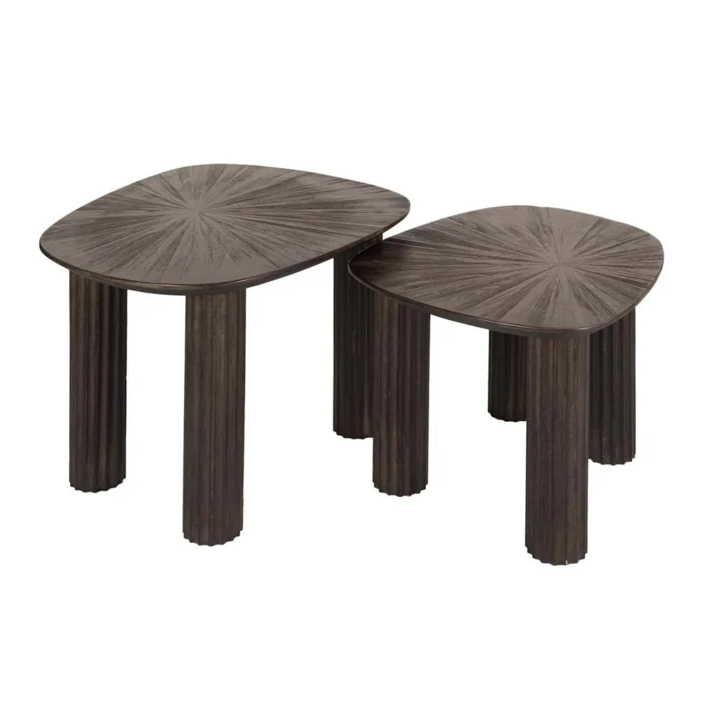 Deze prachtige salontafel set van 2 is ontworpen in een driehoekige, vierhoekige en organische vorm. Deze salontafelset is uitgevoerd in hoogwaardig teakhout met een eigentijdse donkerbruine kleur. Deze combinatie zorgt ervoor dat deze tafels zowel stijl als duurzaamheid uitstralen. De unieke pootjes met een golfpatroon en het unieke ontwerp van het tafelblad zorgen voor een speelse, maar verfijnde uitstraling.