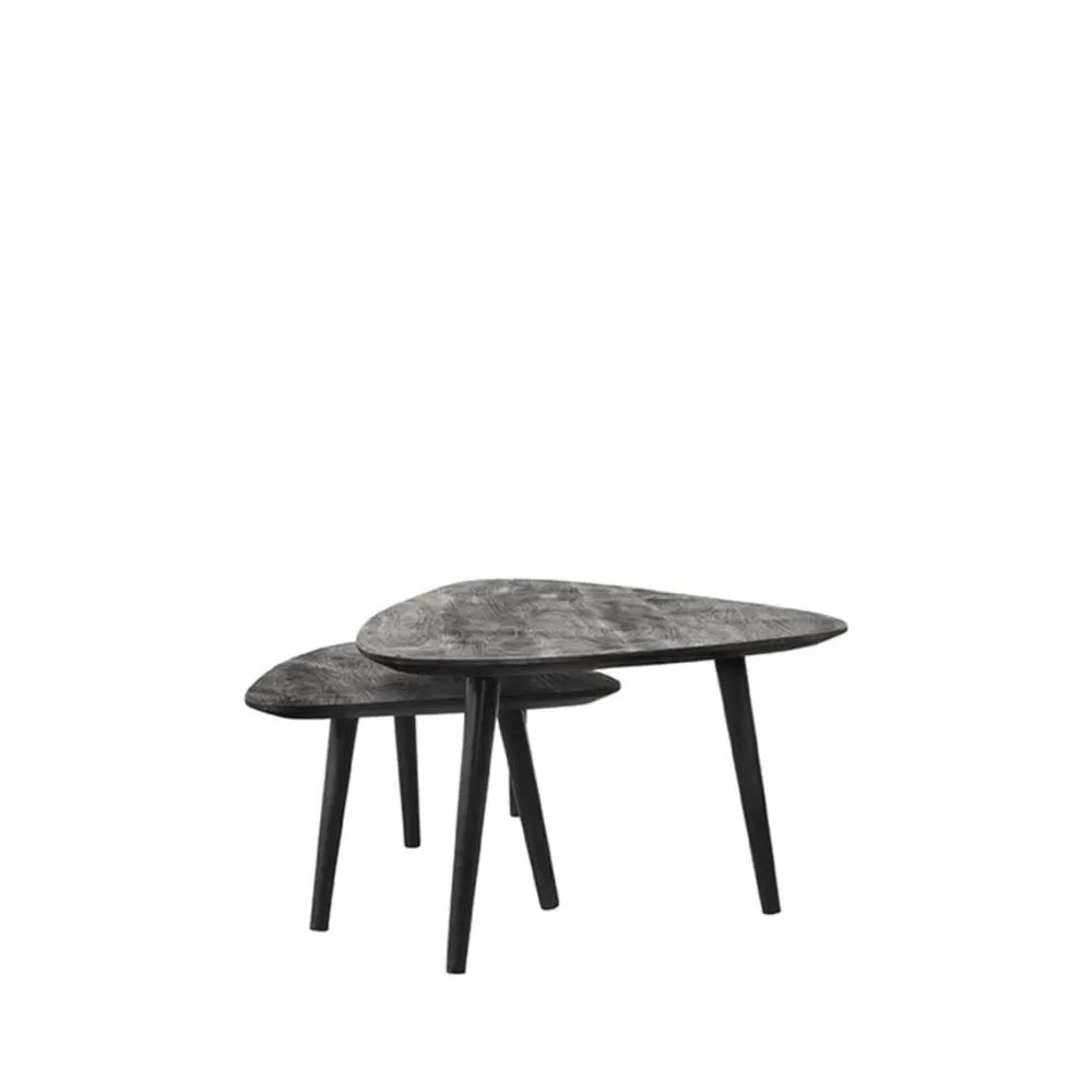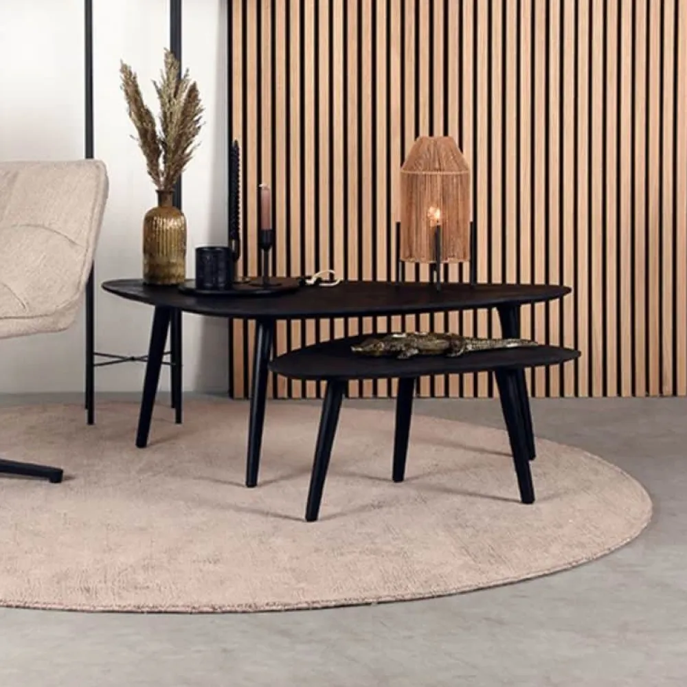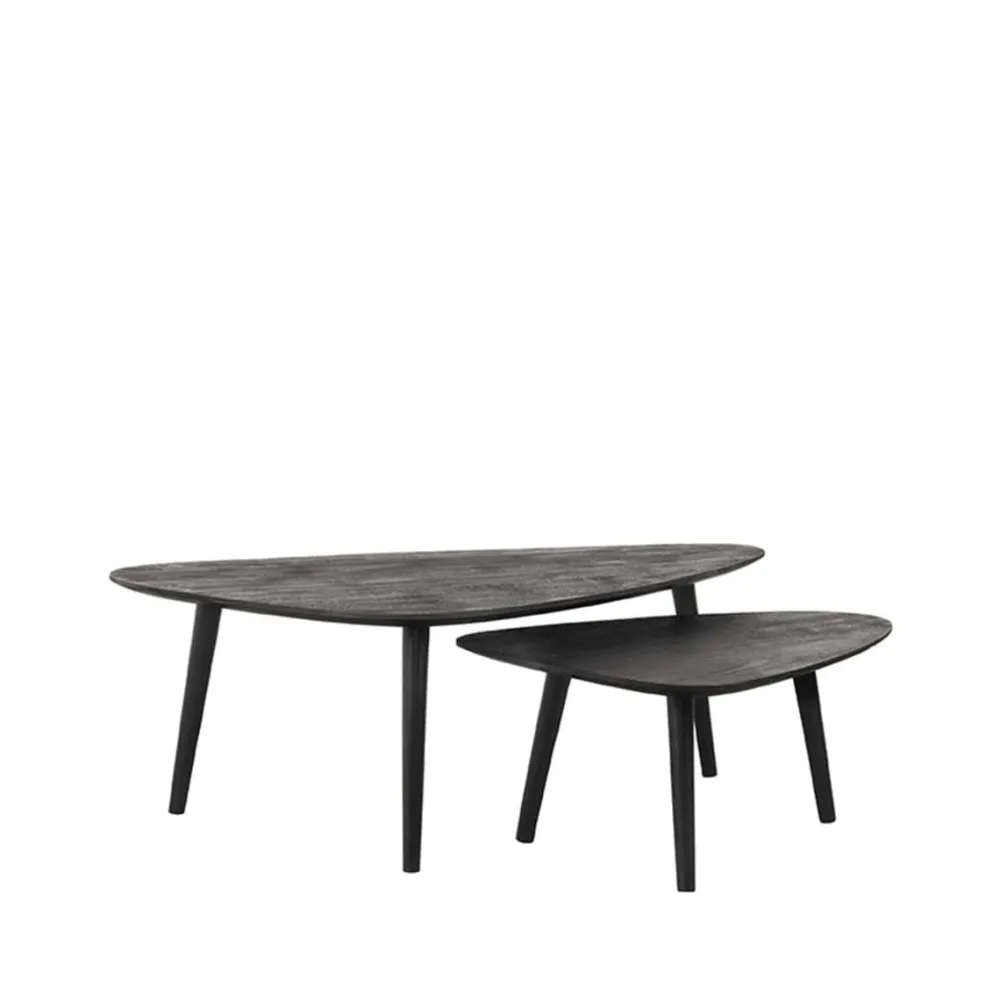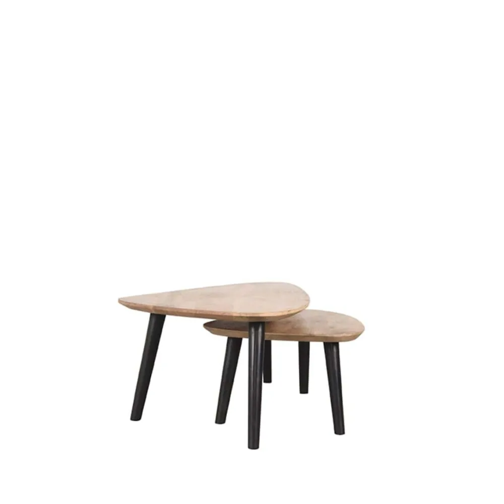 Rock bestaat uit twee organisch gevormde tafels vervaardigd van mangohout. De bladen hebben een modern verjongd blad, wat betekent dat de randen spits toelopen, wat zorgt voor een elegante look. Onder de grote tafel van 110x64x39 cm schuif je makkelijk de kleinere tafel van 69x49x31 cm. Zo bepaal je helemaal zelf hoe je de tafels neerzet. De drie speelse, metalen poten in de kleur zwart geven de tafels een vriendelijk, fris en luchtig karakter.