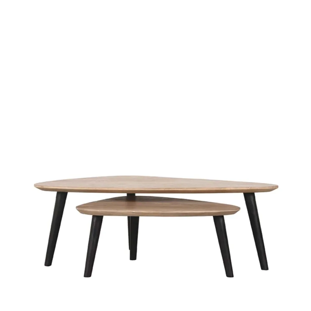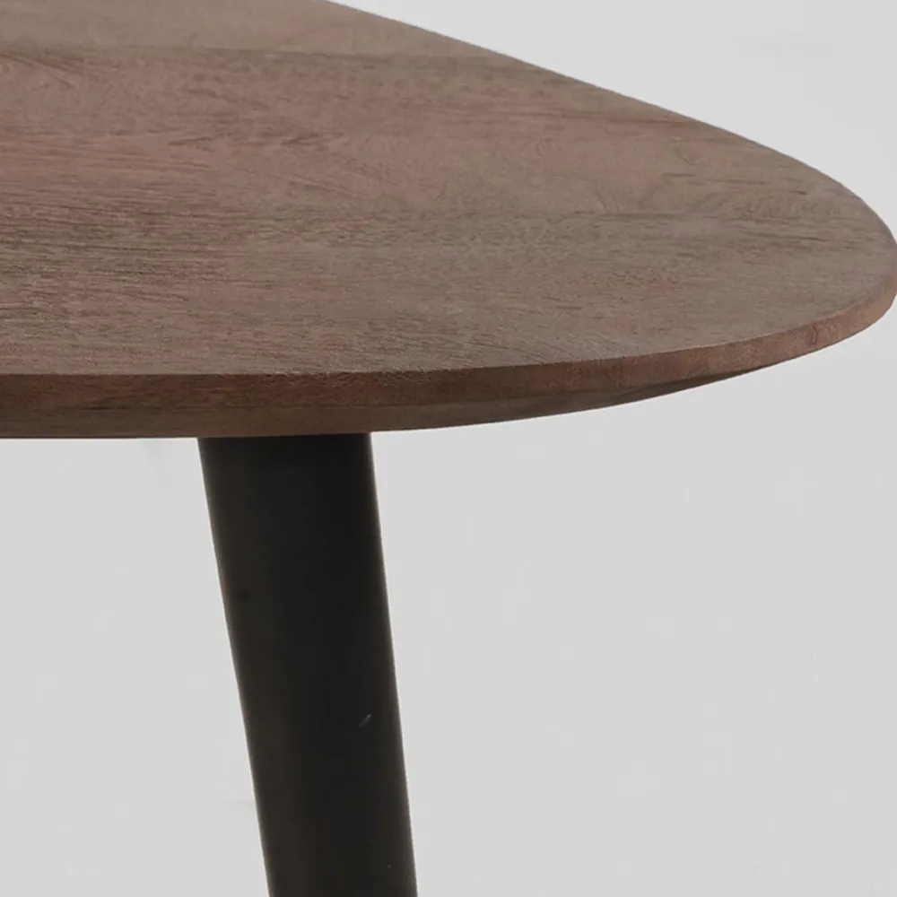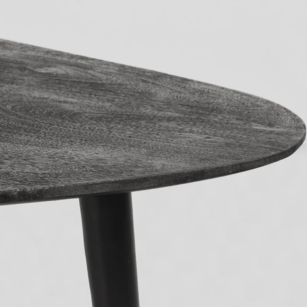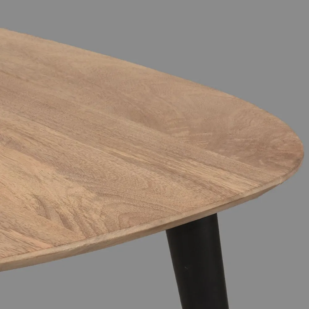 Rock bestaat uit twee organisch gevormde tafels vervaardigd van mangohout. De bladen hebben een modern verjongd blad, wat betekent dat de randen spits toelopen, wat zorgt voor een elegante look. Onder de grote tafel van 110x64x39 cm schuif je makkelijk de kleinere tafel van 69x49x31 cm. Zo bepaal je helemaal zelf hoe je de tafels neerzet. De drie speelse, metalen poten in de kleur zwart geven de tafels een vriendelijk, fris en luchtig karakter.