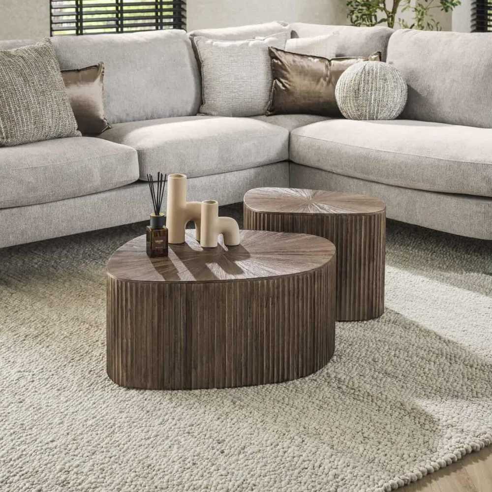 Deze prachtige salontafel set van 2 is ontworpen in een organische vorm en een driekhoekige vorm. Uitgevoerd in hoogwaardig teakhout met een eigentijdse donkerbruine kleur. Deze combinatie zorgt ervoor dat deze tafels zowel stijl als duurzaamheid uitstralen. Het unieke frame met een golfpatroon en het unieke ontwerp van het tafelblad zorgen voor een speelse, maar verfijnde uitstraling.