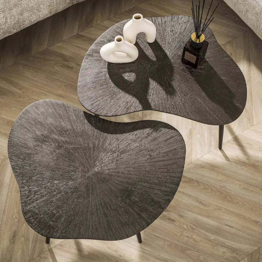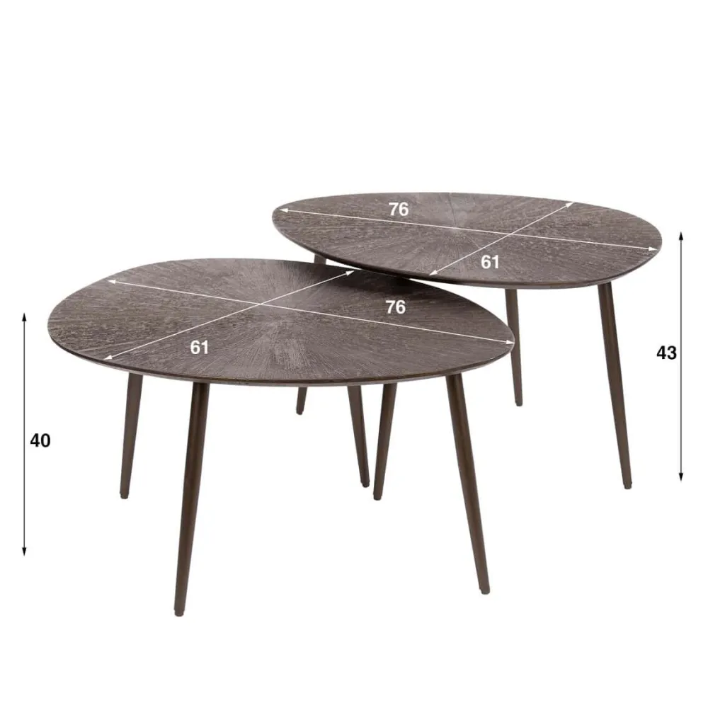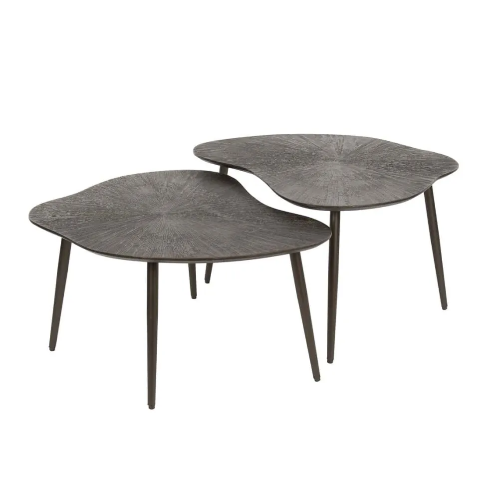 De salontafel Thea is uitgevoerd in een set van twee. Het blad met verjongde rand is gemaakt van MDF en afgewerkt met een Ray Metal finish in een warme bruin-bronzen kleur. De poten zijn slank, licht taps en vervaardigd uit gepoedercoat staal in een bijpassende tint. De tafels kunnen samen of los van elkaar worden gebruikt.