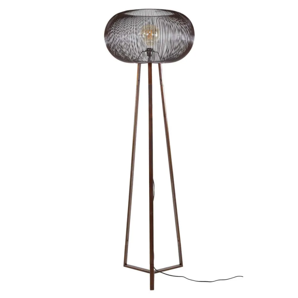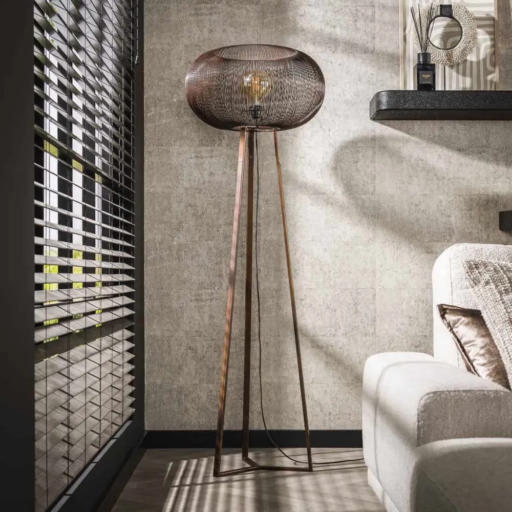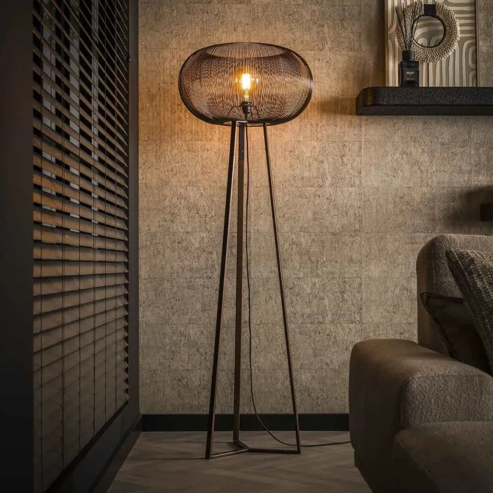Deze trendy vloerlamp Veller is uitgevoerd in metaal. De kap is gemaakt in een disk vorm. Een mooi detail wat verwerkt is in de kap, zijn gouden soldeerplekken. Dit geeft de lamp een heel uniek uiterlijk. Er wordt aanbevolen LED lichtbron filament bol 12.5cm te gebruiken.