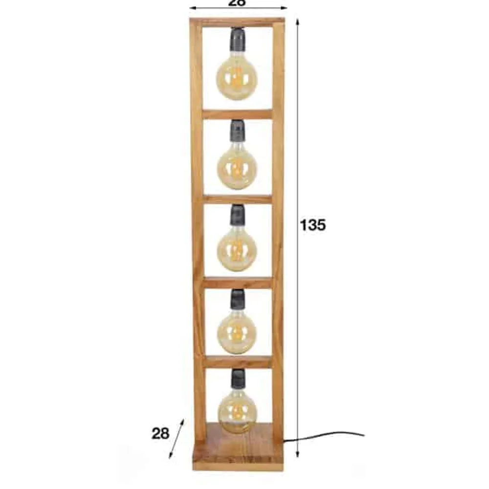 Deze trendy vloerlamp heeft een rechthoekig frame met vijf fittingen, waarbij de lichtbronnen goed zichtbaar zijn en volledig tot hun recht komen. Het armatuur is gemaakt van acacia hout. De stroomkabels zijn verwerkt in lamp. Deze vloerlamp behoort tot een serie, bestaande uit een tafellamp, twee hanglampen en een vloerlamp.