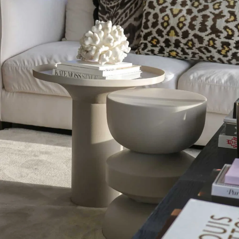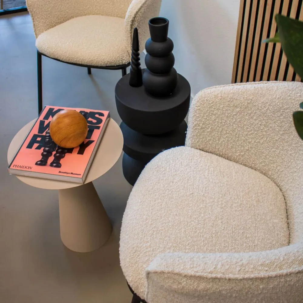 Bijzettafel Jon van Kick – een trendy tafel met speelse rondingen, verkrijgbaar in de kleuren bruin, zwart, beige en okergeel. Deze stijlvolle bijzettafel voegt een moderne en levendige touch toe aan je interieur!