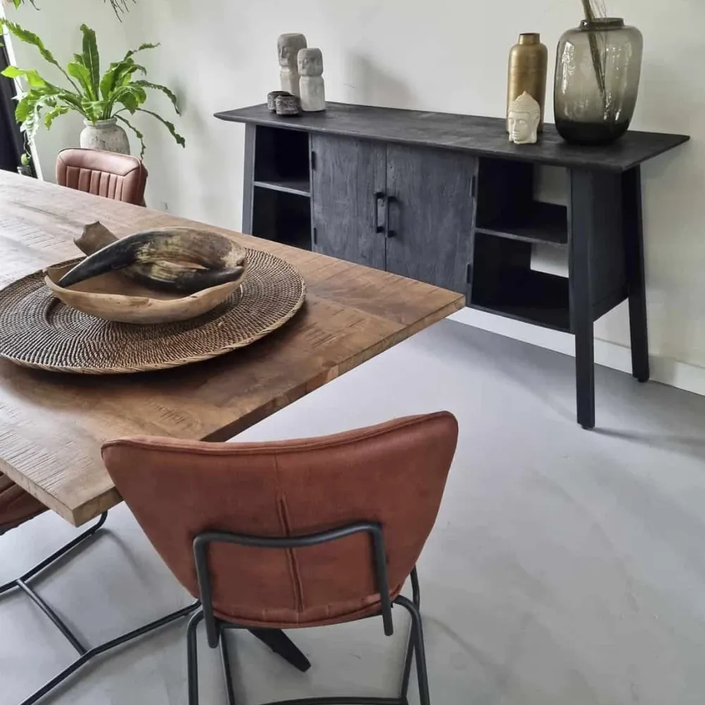 Strak zwart of naturel mangohout met ge-poedercoat stalen pootjes.