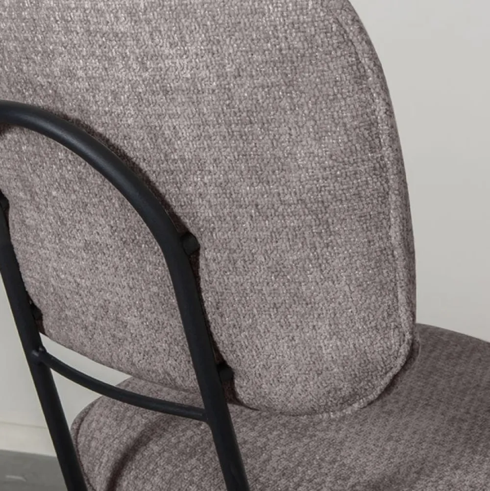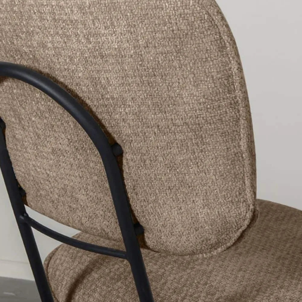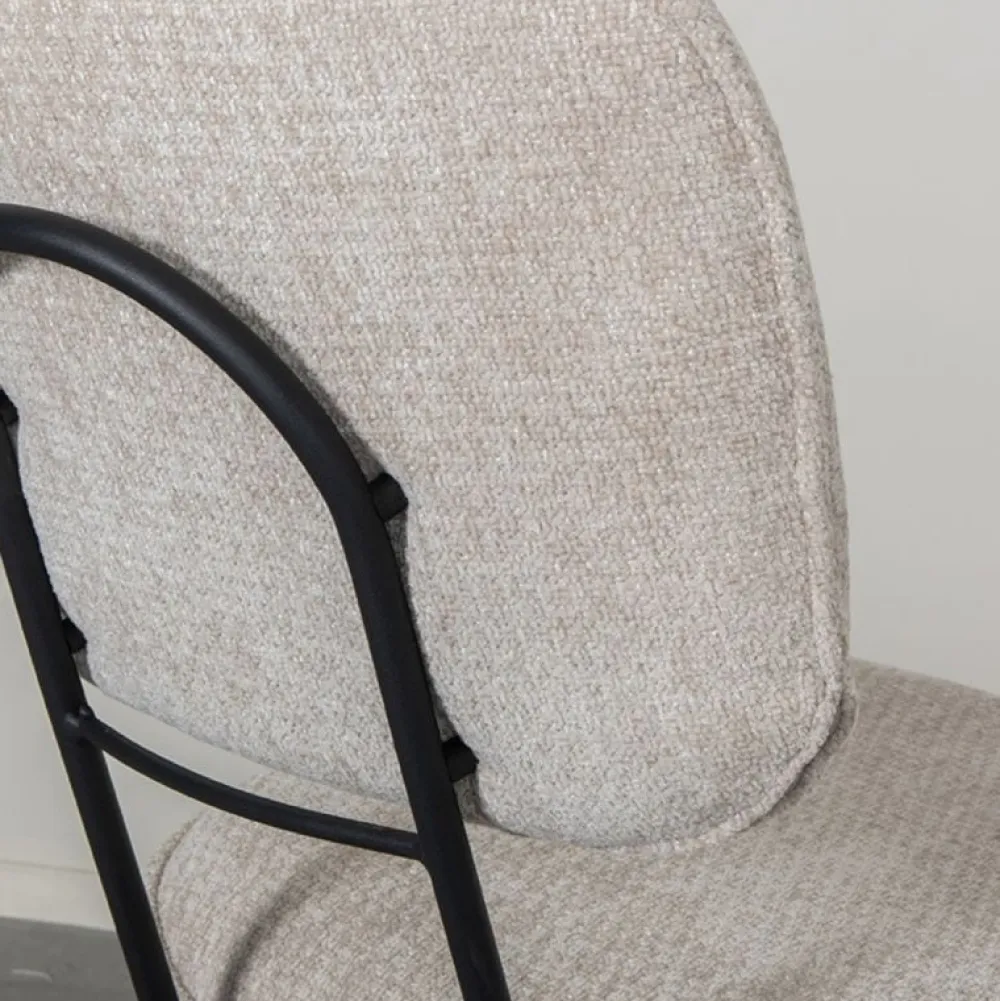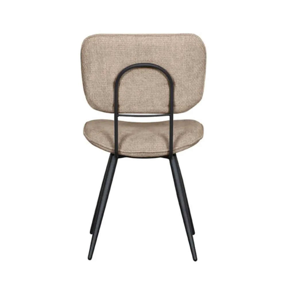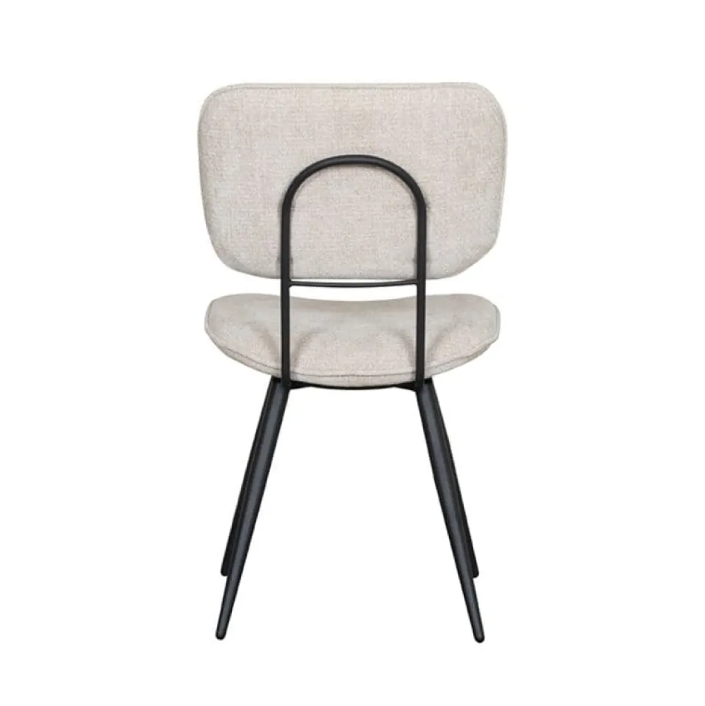 Eetkamerstoel Liva is een elegante en veelzijdige stoel met een verfijnde uitstraling. De afgeronde rugleuning en zitting zijn afzonderlijk vormgegeven en verbonden met een slank, rond metalen frame. Aan de achterzijde van de rugleuning bevindt zich een handgreep, wat de stoel extra praktisch maakt in gebruik. De zwart metalen poten staan licht naar buiten en geven Liva een luchtige, stabiele basis. De stoel is bekleed met de luxe stof Elite en verkrijgbaar in drie kleuren.