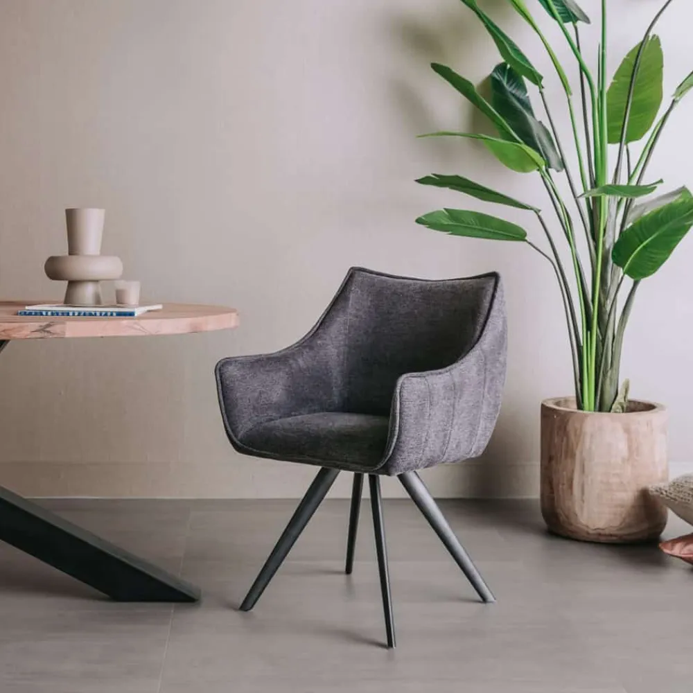 Eetkamerstoel Riviera is een stijlvolle draaistoel die elegantie en comfort samenbrengt. De ergonomisch gevormde kuip is bekleed met luxe textiel en voorzien van verfijnde stikdetails. Het zwarte metalen onderstel geeft de stoel een moderne uitstraling, terwijl de geïntegreerde armleuningen zorgen voor extra comfort. Riviera is uitgevoerd met een 180 graden draaifunctie en automatische terugkeer, wat zorgt voor extra gebruiksgemak. De stoel is verkrijgbaar in drie grijstinten en wordt geleverd per twee stuks.