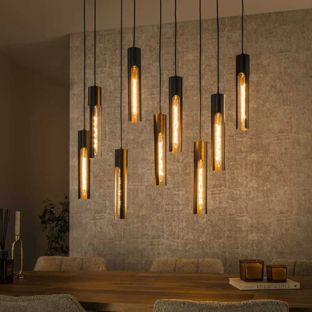 Deze hanglamp Carolien is uitgevoerd in metaal met een artic black finish. De lamp bestaat uit 5 of 9 prachtige buizen waardoor de ruimte mooi gedoseerd verlicht wordt. Deze lamp geeft ieder huis een beetje meer sfeer! Alle lampen zijn afzonderlijk tot 150 cm in hoogte verstelbaar. Er wordt aanbevolen LED lichtbron filament BUIS 18.5cm te gebruiken.