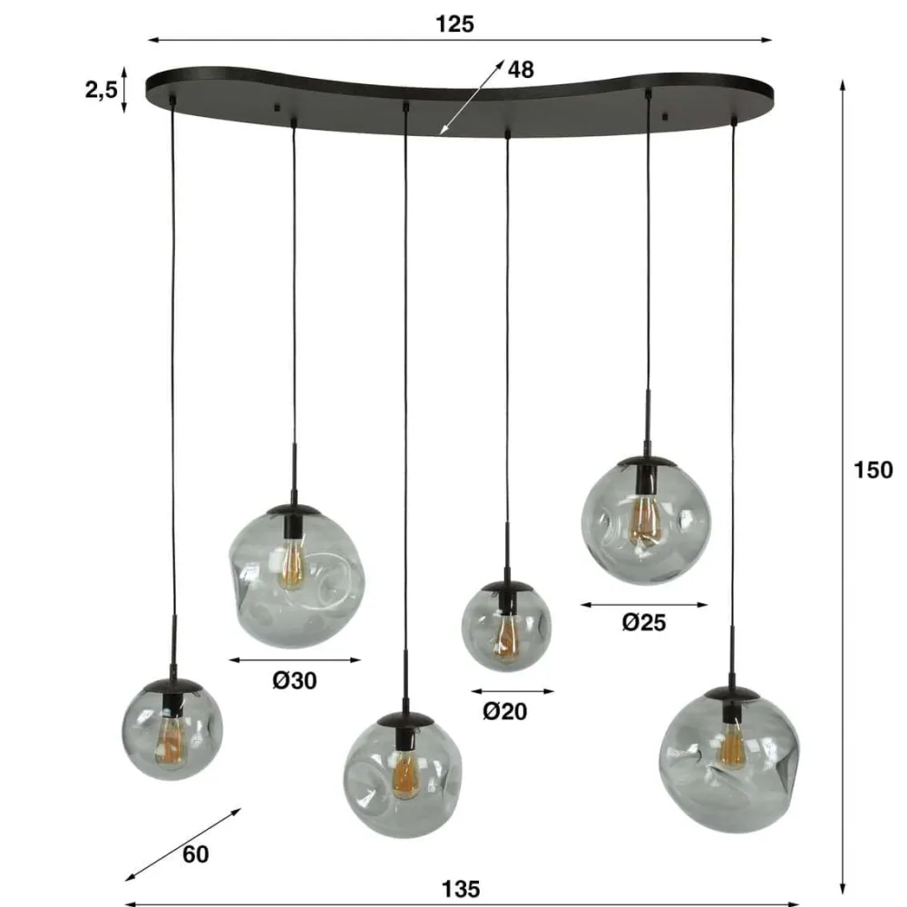 Hanglamp Estelle is een stijlvolle verlichtingsoptie voor boven iedere eettafel. De zes glazen kappen zitten met een verstelbaar snoer vast aan een organisch gevormde plafond base. Ze zijn dus ieder afzonderlijk verstelbaar tot een maximale lengte van 150 cm. De kappen kunnen los gehaald worden, waardoor de lichtbron gemakkelijk geplaatst kan worden.