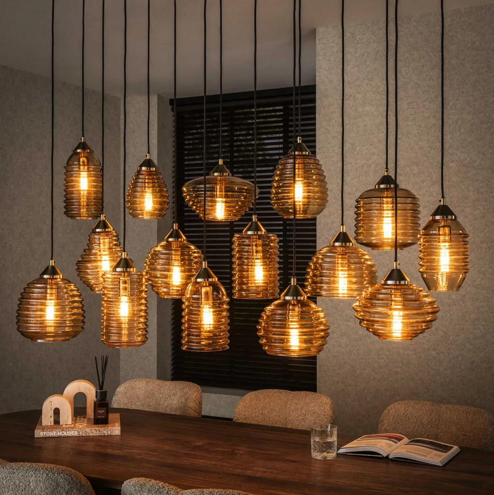 Deze trendy hanglamp Leonora is een echte eye-catcher! De lamp is uitgevoerd met 15 verschillende kapjes. De kapjes hebben een prachtige horizontale bewerking. De kapjes zijn ieder tot 150 cm in hoogte verstelbaar en kunnen naar eigen inzicht speels opgehangen worden.