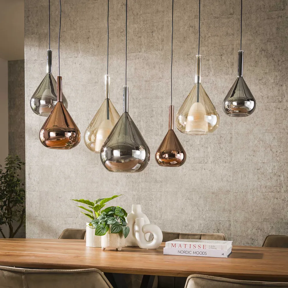 Hanglamp Triangle bestaat uit zeven glazen kappen in druppelvorm, ze hebben diverse formaten en kleuren: amber, koper en chroom. De binnenzijde van de kappen is gezandstraald, wat zorgt voor een matte uitstraling aan de binnenkant. Iedere lamp is afzonderlijk in hoogte verstelbaar tot 150 cm, waardoor er vrijheid is in het creëren van een compositie. De plafondplaat is uitgevoerd in zwart metaal.