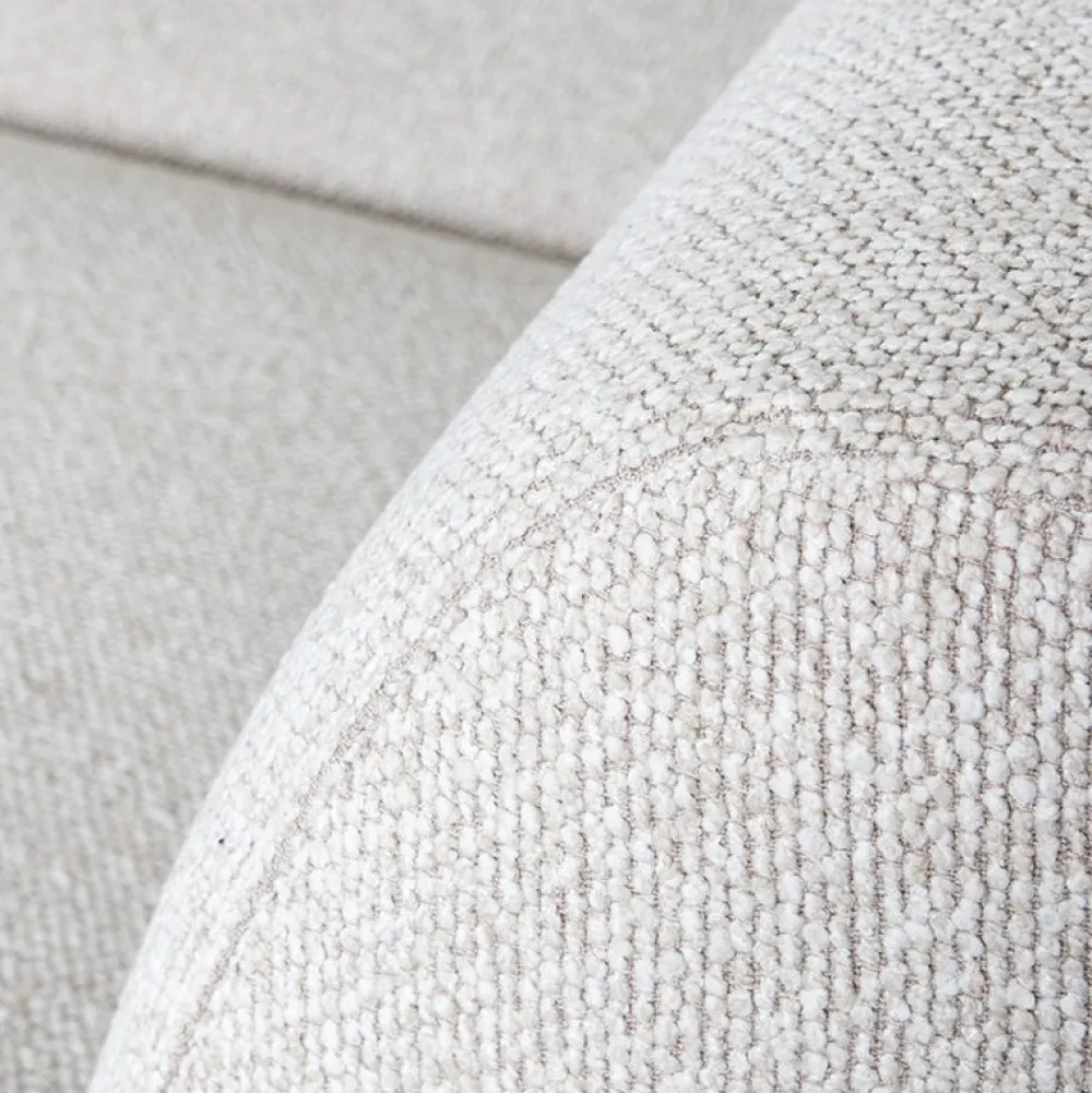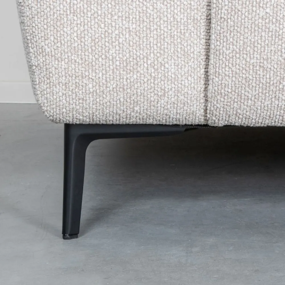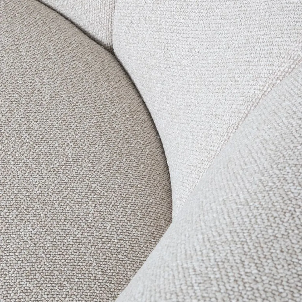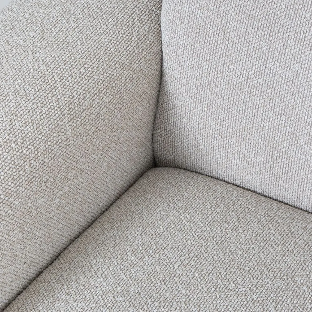 De bank is bekleed met een zachte, hoogwaardige stof die prettig aanvoelt en bijdraagt aan het comfortabele karakter. De zit is uitnodigend en biedt fijne ondersteuning, waardoor je zowel ontspannen kunt loungen als comfortabel kunt zitten. De subtiel gevormde armleuningen en rugleuning zorgen voor extra zitgemak, terwijl het geheel rustig en in balans blijft.
