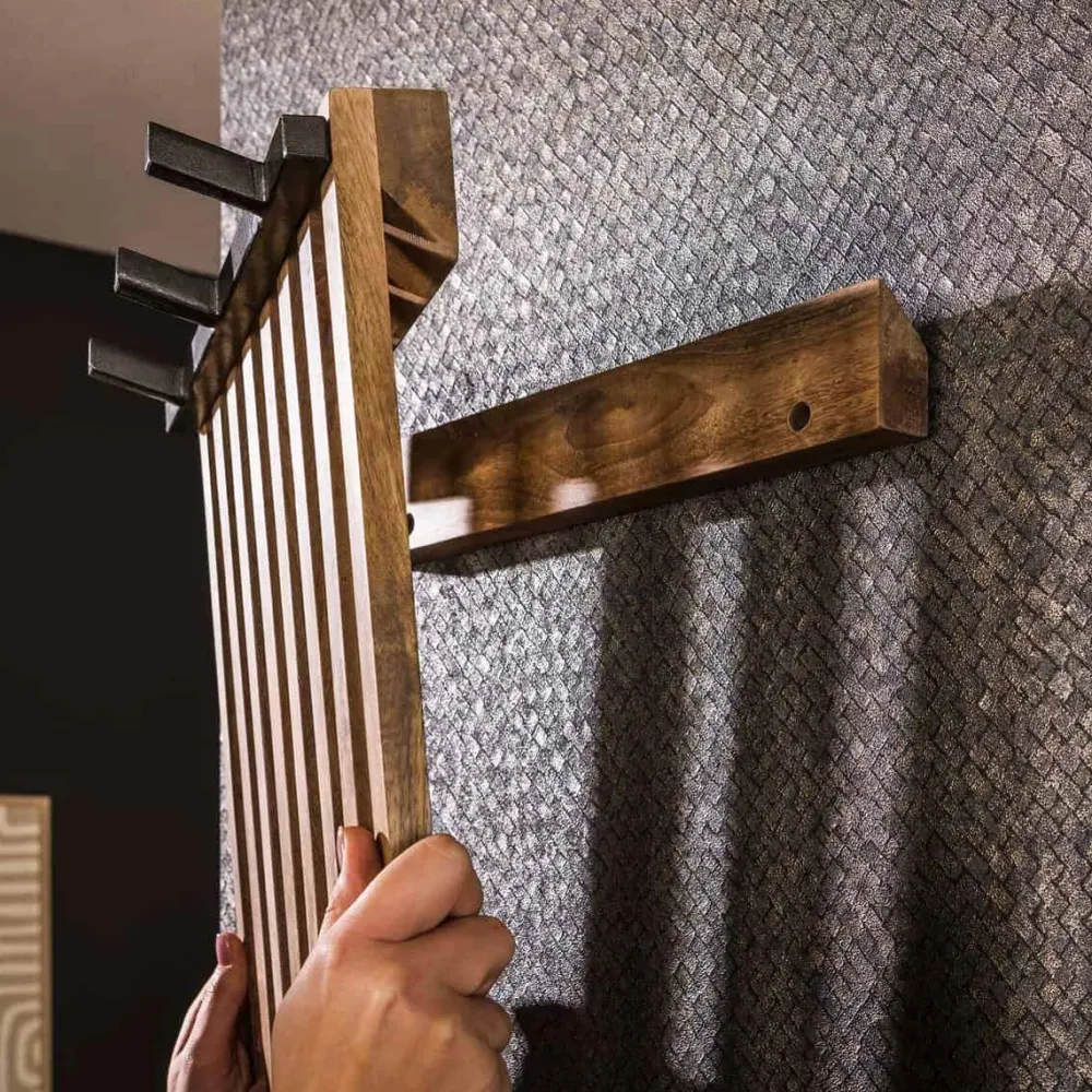 Deze kapstok Bradley is uitgevoerd in mango hout met een zandkleur finish en beschikt over 6 haken. De spijlen geven deze kapstok een ambachtelijke en zeer eigentijdse look. De kapstok wordt door middel van een strip aan de wand gemonteerd. De strip wordt in de wand geboord en daar kan de kapstok dan op rusten. Zie hiervoor de foto.