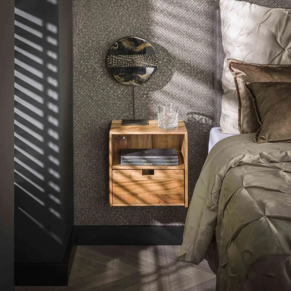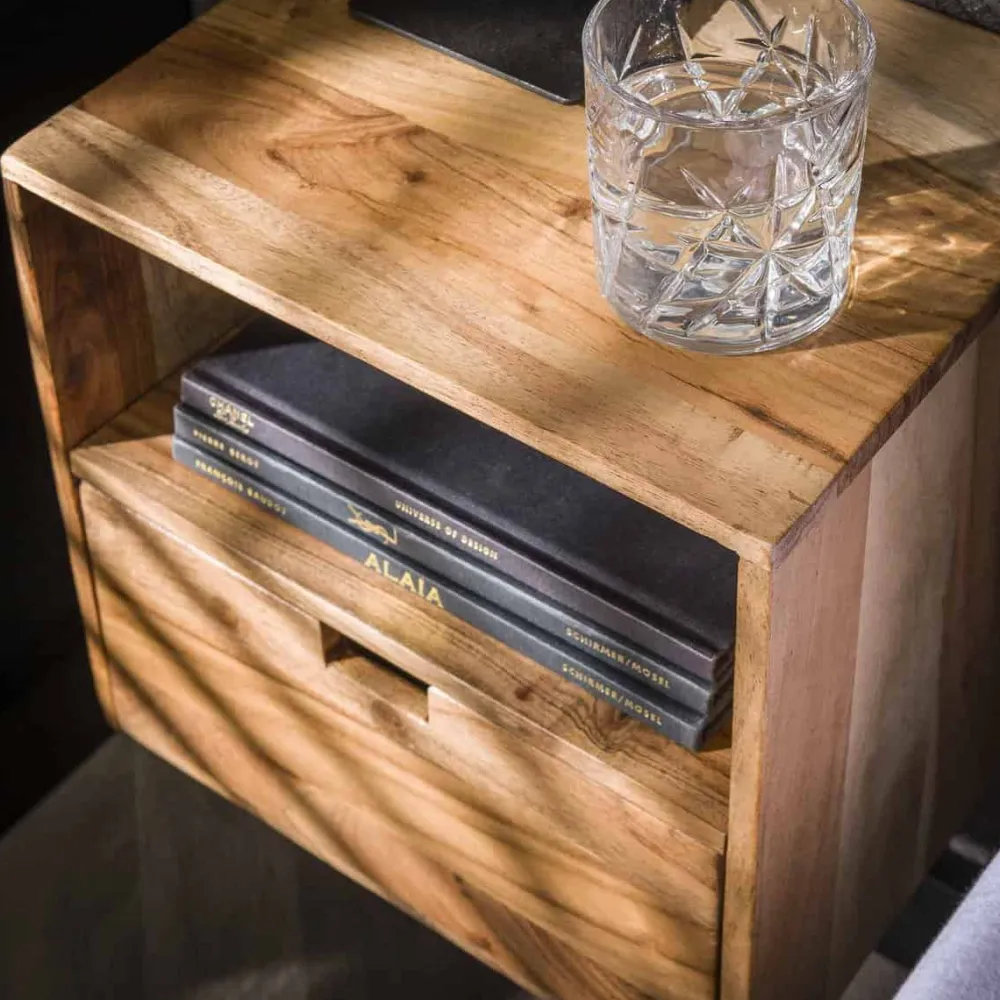 Dit nachtkastje Ebony is uitgevoerd in acacia hout. Het nachtkastje heeft een lade en een open vak. Het nachtkastje wordt door middel van 2 schroeven aan de wand gemonteerd. Een eigentijds en minimalistisch nachtkastje, geschikt voor iedere slaapkamer! Dit nachtkastje bestaat uit een set van 2.