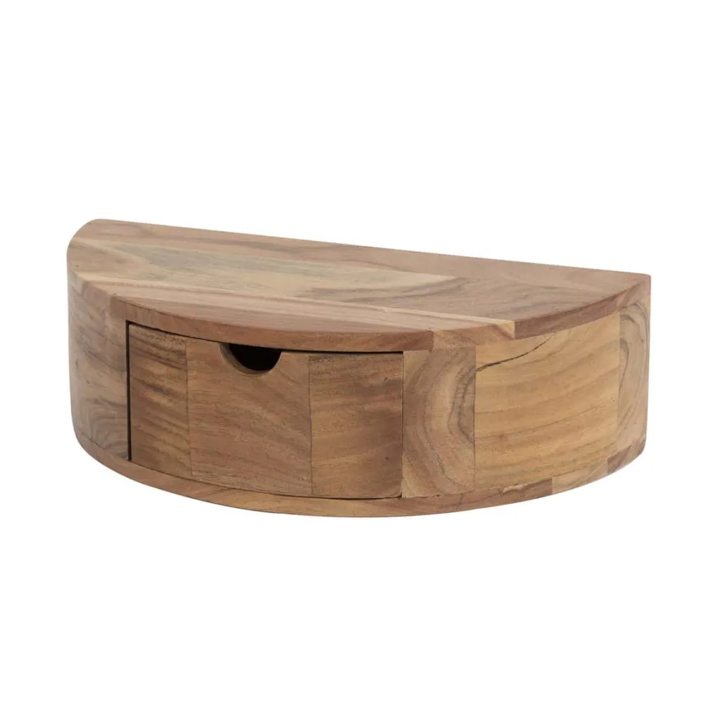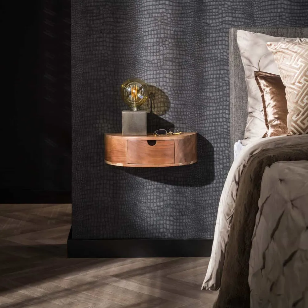 Dit nachtkastje Emmett is uitgevoerd in acacia hout met een lade en een schapje. Het nachtkastje wordt door middel van een metalen wandstrip aan de wand gemonteerd. Zie hiervoor de afbeelding.