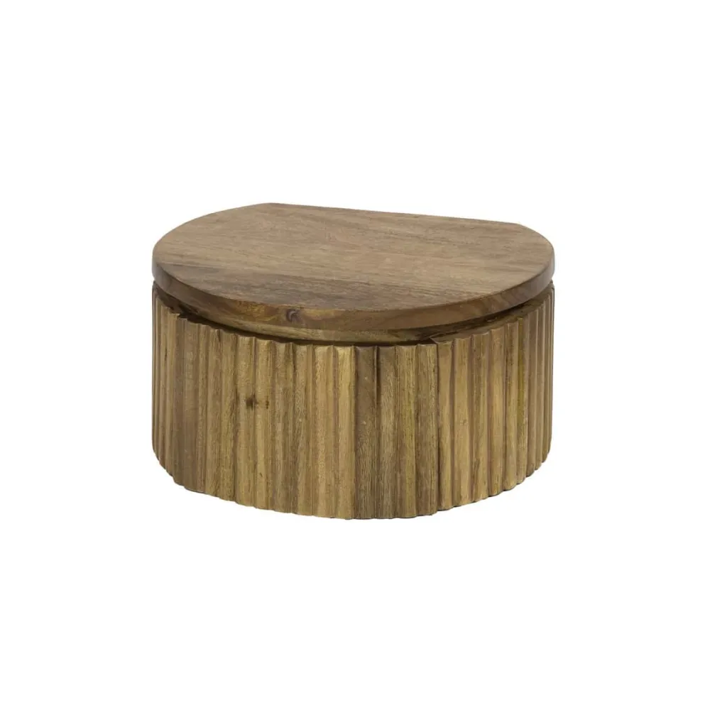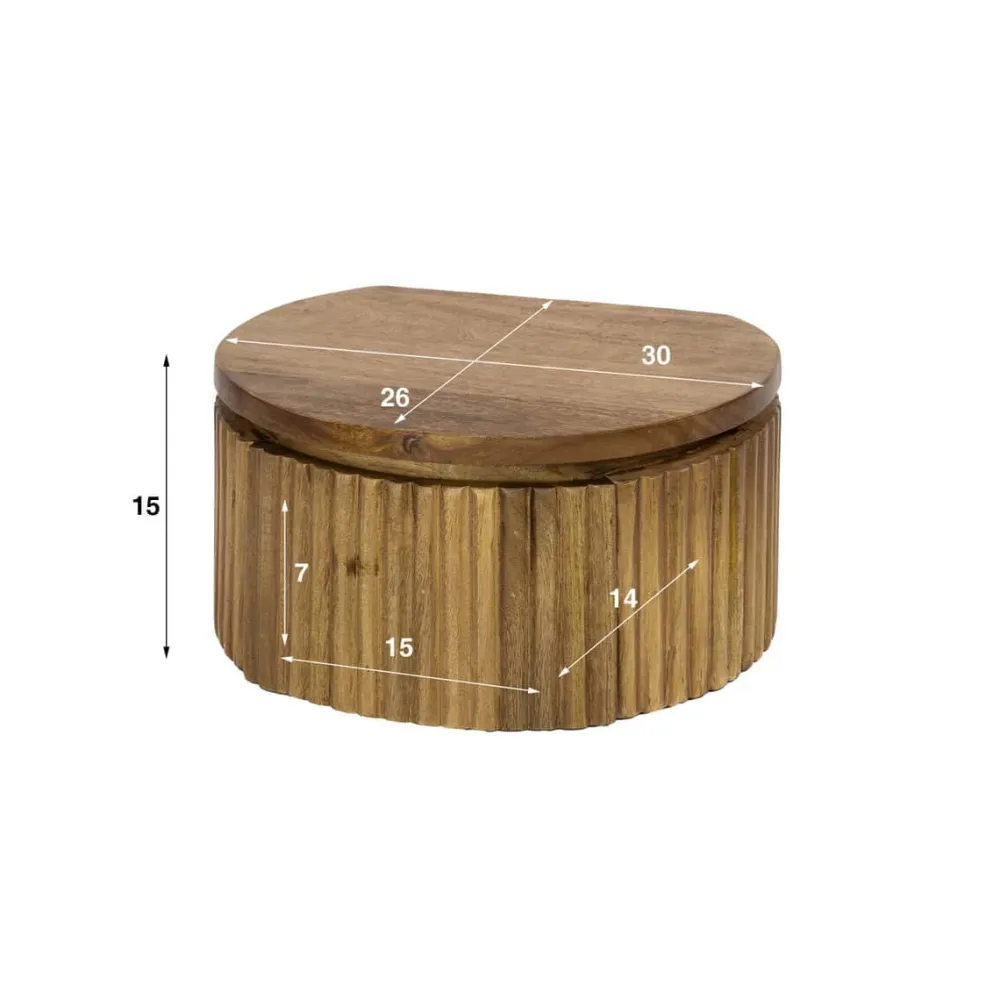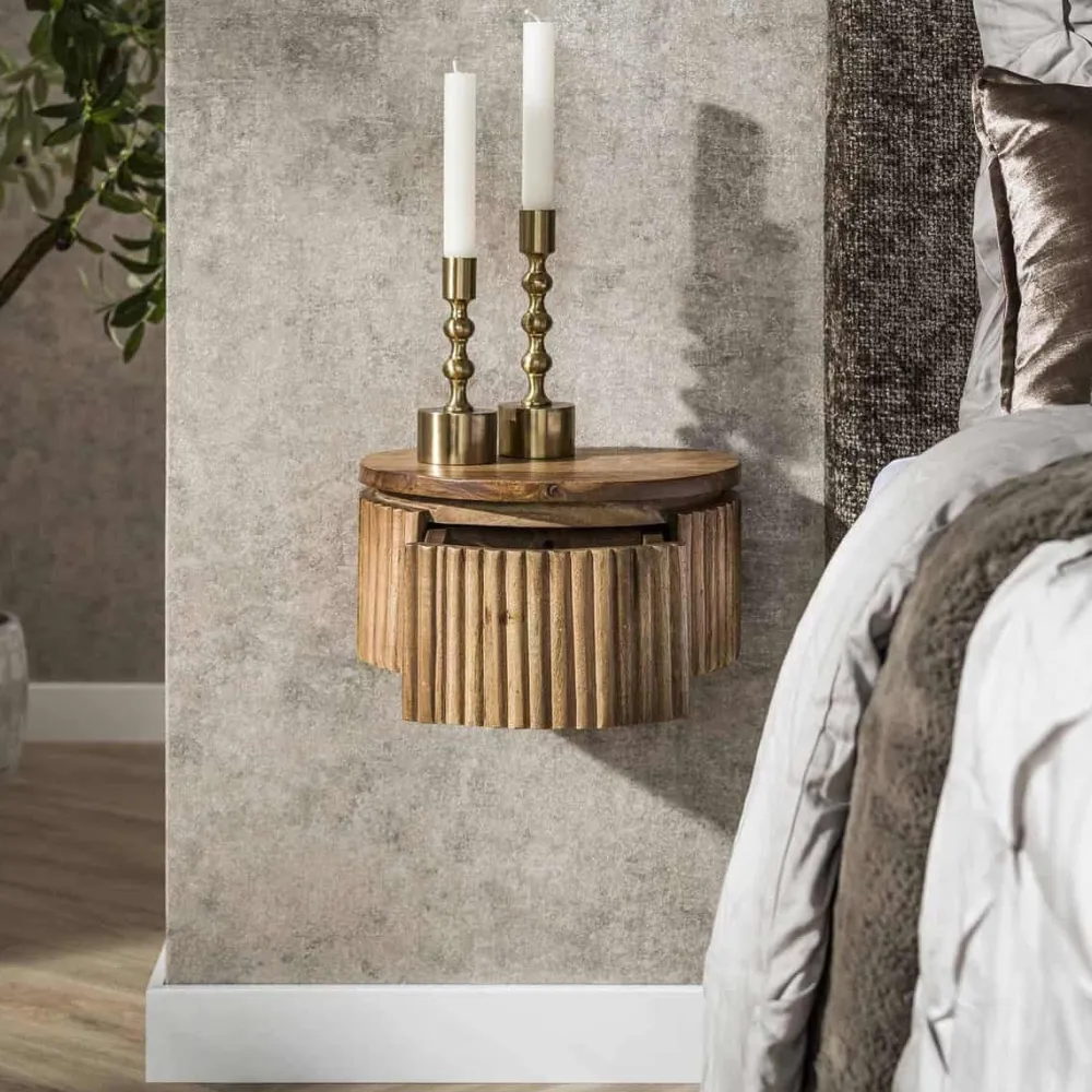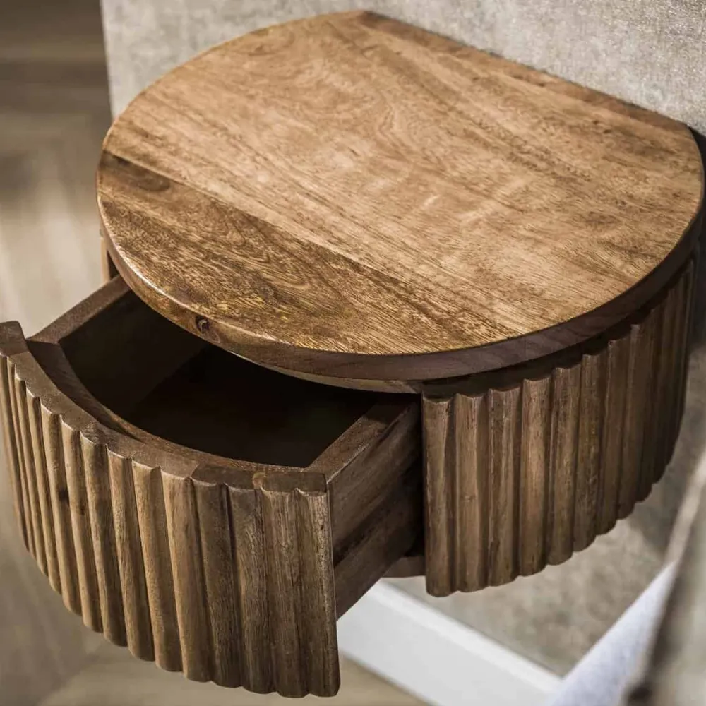 Het ronde nachtkastje Fleur is gemaakt van massief mangohout met een zandkleurige afwerking. Het ronde ontwerp is rondom voorzien van een verfijnd verticaal golfpatroon. Het nachtkastje bevat één lade voor het opbergen van dagelijkse benodigdheden. Het is ontworpen om aan de muur te worden bevestigd en eenvoudig te monteren met een strip voorzien van schroefgaten.